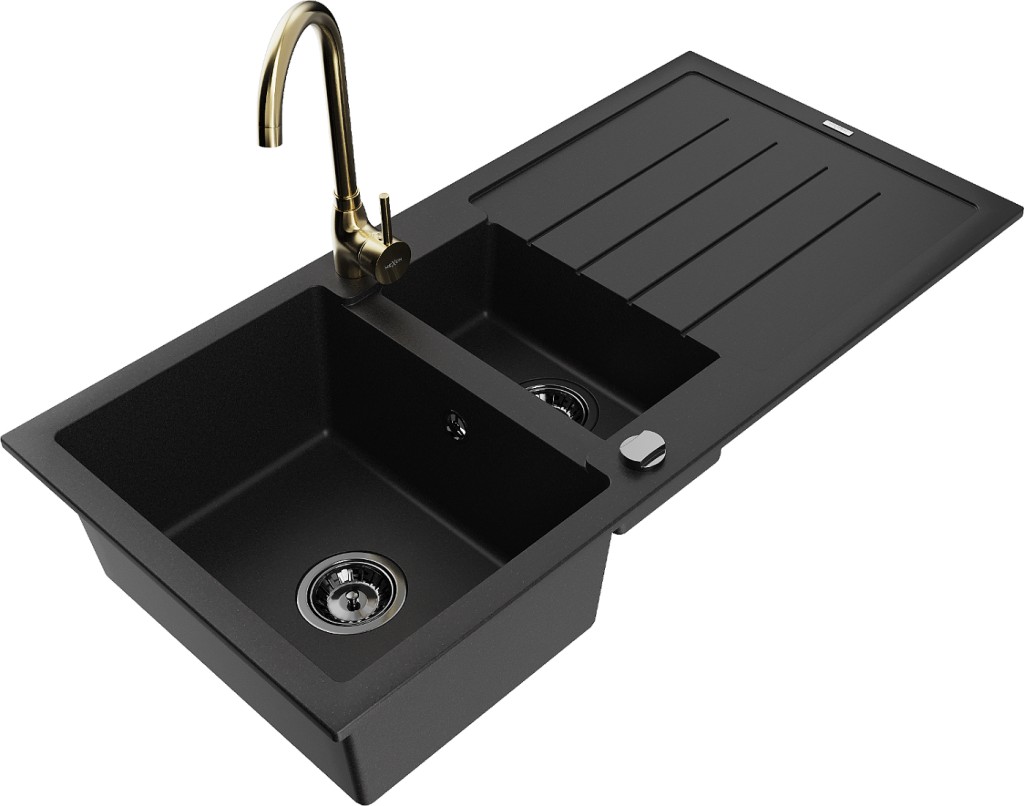Technické dáta: Drez: Rozmer: 1000x500x200 mm Hĺbka komory: 190 mm (väčšia), 115 mm (menšia) Rozmery komory: 430x330 mm (väčšie), 340x170 mm (menšie) Priemer odtoku: ø90 mm Typ: 1,5-miska s odkvapkávačom Typ: Zapustené do pracovnej dosky Čierna farba Povrchová úprava sifónu: čierna Materiál: žula (80% žulové kamenivo 20% živice) Prepadový otvor: Áno Otvory: (batérie, automat) 2 Inštalácia: Univerzálna, je možné inštalovať s odkvapkávačom na ľavú alebo pravú stranu Vysoká odolnosť proti poškriabaniu a zmene farby Odolnosť proti tepelným šokom Povrch pre ľahké čistenie Dva dodatočné vyfrézované otvory na samodierovanie ø35 Kuchynská batéria: Materiál: mosadz Farba: Zlatá Hlava: Keramická Perlátor: Áno Typ: Jednopákové Výška batérie: 335 mm Rozsah výtoku: 180 mm(GT) Ean: 5905315015914