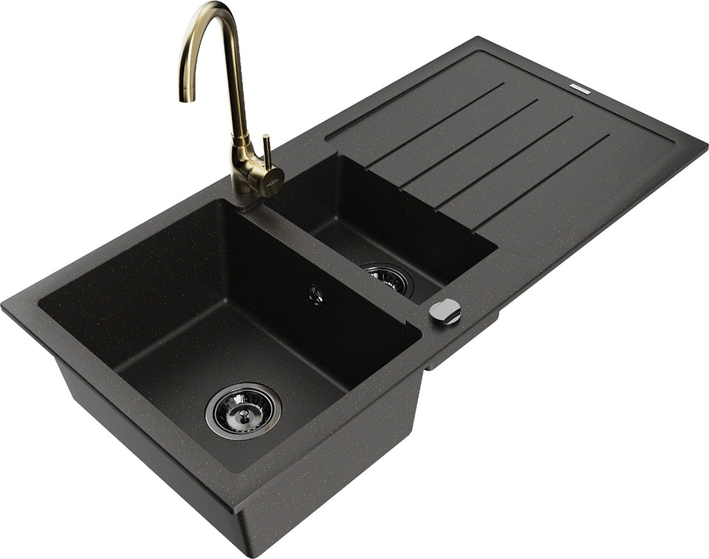 Technické dáta: Drez: Rozmer: 1000x500x200 mm Hĺbka komory: 190 mm (väčšia), 115 mm (menšia) Rozmery komory: 430x330 mm (väčšie), 340x170 mm (menšie) Priemer odtoku: ø90 mm Typ: 1,5-miska s odkvapkávačom Typ: Zapustené do pracovnej dosky Farba: čierna / zlatá metalíza Povrchová úprava sifónu: čierna Materiál: žula (80% žulové kamenivo 20% živice) Prepadový otvor: Áno Otvory: (batérie, automat) 2 Inštalácia: Univerzálna, je možné inštalovať s odkvapkávačom na ľavú alebo pravú stranu Vysoká odolnosť proti poškriabaniu a zmene farby Odolnosť proti tepelným šokom Povrch pre ľahké čistenie Dva dodatočné vyfrézované otvory na samodierovanie ø35 Kuchynská batéria: Materiál: mosadz Farba: Zlatá Hlava: Keramická Perlátor: Áno Typ: Jednopáková Výška batérie: 335 mm Rozsah výtoku: 180 mm(GT) Ean: 5905315015860