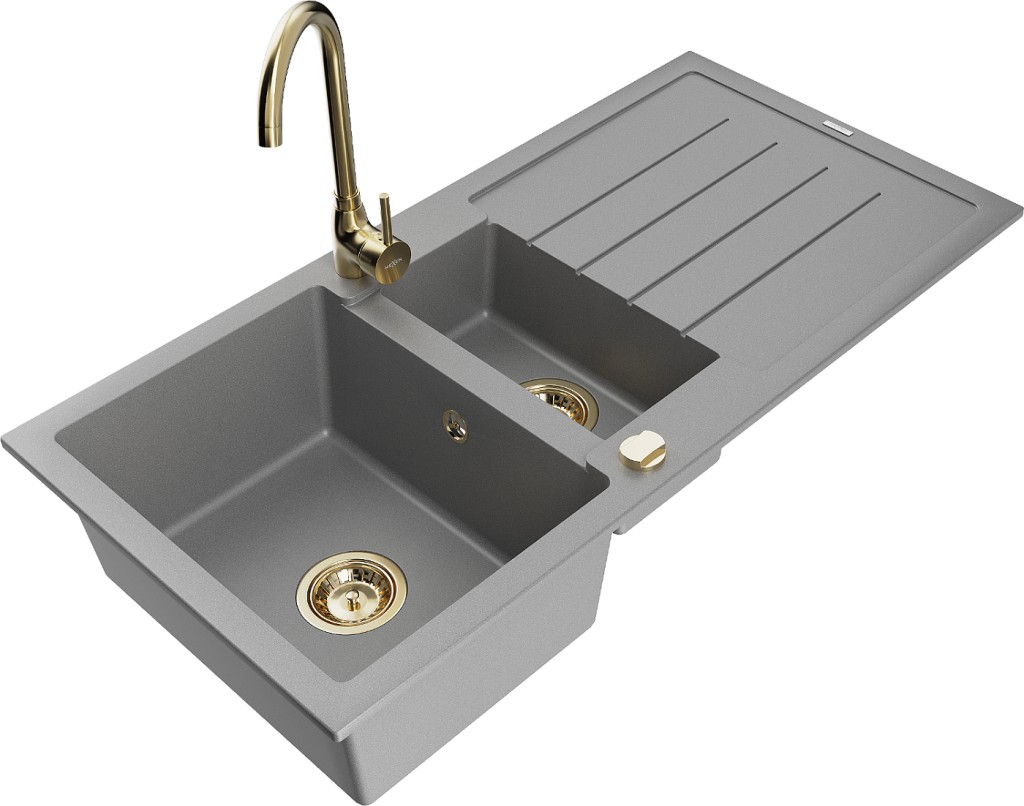 Technické dáta: Drez: Rozmer: 1000x500x200 mm Hĺbka komory: 190 mm (väčšia), 115 mm (menšia) Rozmery komory: 430x330 mm (väčšie), 340x170 mm (menšie) Priemer odtoku: ø90 mm Typ: 1,5-miska s odkvapkávačom Typ: Zapustené do pracovnej dosky Šedá farba Povrchová úprava sifónu: zlatá Materiál: žula (80% žulové kamenivo 20% živice) Prepadový otvor: Áno Otvory: (batérie, automat) 2 Inštalácia: Univerzálna, je možné inštalovať s odkvapkávačom na ľavú alebo pravú stranu Vysoká odolnosť proti poškriabaniu a zmene farby Odolnosť proti tepelným šokom Povrch pre ľahké čistenie Dva dodatočné vyfrézované otvory na samodierovanie ø35 Kuchynská batéria: Materiál: mosadz Farba: Zlatá Hlava: Keramická Perlátor: Áno Typ: Jednopákové Výška batérie: 335 mm Rozsah výtoku: 180 mm(GT) Ean: 5905315015808