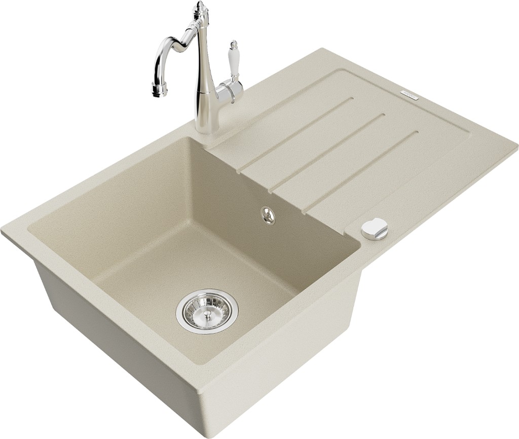 Technické dáta: drez: Rozmer: 795 x 495 x 200 mm Hĺbka komory: 200 mm Rozmery komory: 440x360 mm Priemer odtoku: ø90 mm Typ: 1-miska s odkvapkávačom Typ: Zapustené do pracovnej dosky Farba béžová Povrchová úprava sifónu: Chrome Materiál: žula (80% žulové kamenivo, 20% živice) Prepadový otvor: Áno Otvory: (batérie, automatické) 2 Inštalácia: Univerzálna, je možné inštalovať s odkvapkávačom na ľavú alebo pravú stranu Vysoká odolnosť proti poškriabaniu a zmene farby Odolnosť proti tepelným šokom Ľahko čistiteľný povrch Dva dodatočné vyfrézované otvory na samodierovanie ø35 kuchynská batéria: Materiál: mosadz Farba: Chrome Hlava: Keramická Prevzdušňovač: Áno Typ: Jedna páka Výška batérie: 290 mm Rozsah výtoku: 260 mm (GT) Ean: 5905315040626