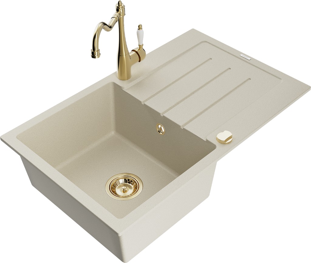 Technické dáta: drez: Rozmer: 795 x 495 x 200 mm Hĺbka komory: 200 mm Rozmery komory: 440x360 mm Priemer odtoku: ø90 mm Typ: 1-miska s odkvapkávačom Typ: Zapustené do pracovnej dosky Farba béžová Povrchová úprava sifónu: zlatá Materiál: žula (80% žulové kamenivo, 20% živice) Prepadový otvor: Áno Otvory: (batérie, automatické) 2 Inštalácia: Univerzálna, je možné inštalovať s odkvapkávačom na ľavú alebo pravú stranu Vysoká odolnosť proti poškriabaniu a zmene farby Odolnosť proti tepelným šokom Ľahko čistiteľný povrch Dva dodatočné vyfrézované otvory na samodierovanie ø35 kuchynská batéria: Materiál: mosadz Farba: Zlatá Hlava: Keramická Prevzdušňovač: Áno Typ: Jedna páka Výška batérie: 290 mm Rozsah výtoku: 260 mm(GT) Ean: 5905315040640