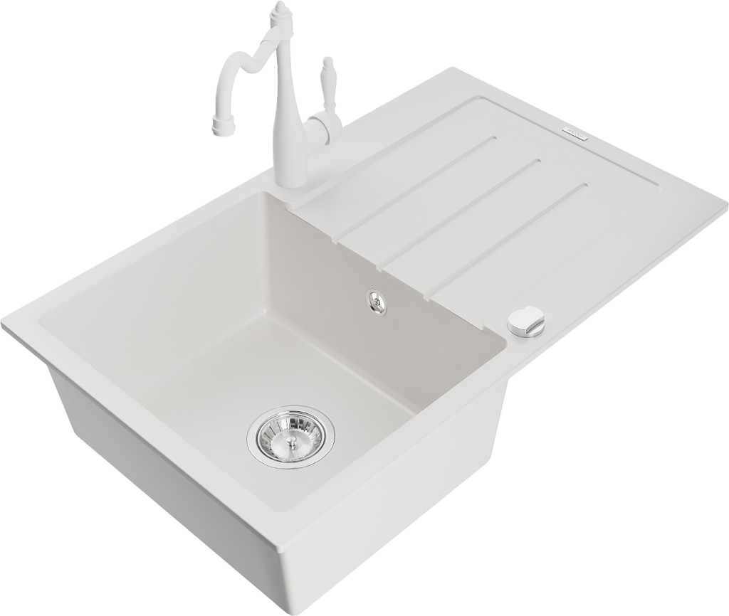 Technické dáta: drez: Rozmer: 795 x 495 x 200 mm Hĺbka komory: 200 mm Rozmery komory: 440x360 mm Priemer odtoku: ø90 mm Typ: 1-miska s odkvapkávačom Typ: Zapustené do pracovnej dosky biela farba Povrchová úprava sifónu: Chrome Materiál: žula (80% žulové kamenivo, 20% živice) Prepadový otvor: Áno Otvory: (batérie, automatické) 2 Inštalácia: Univerzálna, je možné inštalovať s odkvapkávačom na ľavú alebo pravú stranu Vysoká odolnosť proti poškriabaniu a zmene farby Odolnosť proti tepelným šokom Ľahko čistiteľný povrch Dva dodatočné vyfrézované otvory na samodierovanie ø35 kuchynská batéria: Materiál: mosadz biela farba Hlava: Keramická Prevzdušňovač: Áno Typ: Jedna páka Výška batérie: 290 mm Rozsah výtoku: 260 mm(GT) Ean: 5905315040596