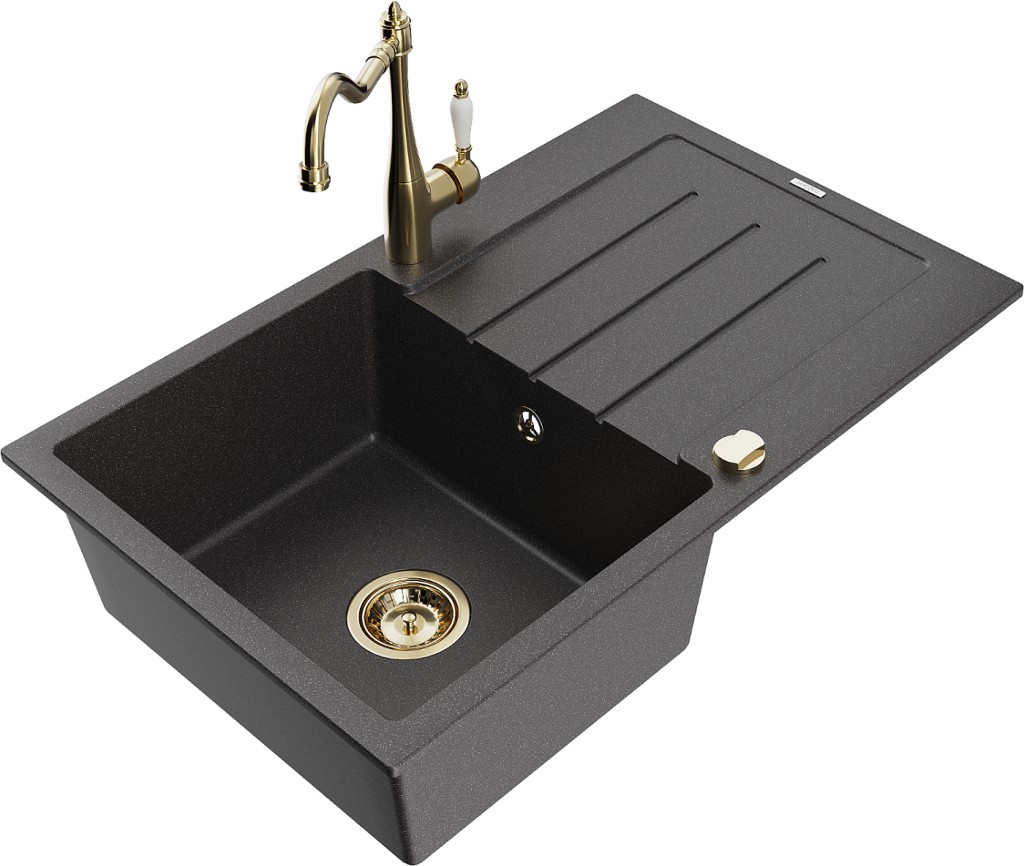 Technické dáta: drez: Rozmer: 795 x 495 x 200 mm Hĺbka komory: 200 mm Rozmery komory: 440x360 mm Priemer odtoku: ø90 mm Typ: 1-miska s odkvapkávačom Typ: Zapustené do pracovnej dosky Farba: Škvrnitá čierna Povrchová úprava sifónu: zlatá Materiál: žula (80% žulové kamenivo, 20% živice) Prepadový otvor: Áno Otvory: (batérie, automatické) 2 Inštalácia: Univerzálna, je možné inštalovať s odkvapkávačom na ľavú alebo pravú stranu Vysoká odolnosť proti poškriabaniu a zmene farby Odolnosť proti tepelným šokom Ľahko čistiteľný povrch Dva dodatočné vyfrézované otvory na samodierovanie ø35 kuchynská batéria: Materiál: mosadz Farba: Zlatá Hlava: Keramická Prevzdušňovač: Áno Typ: Jedna páka Výška batérie: 290 mm Rozsah výtoku: 260 mm(GT) Ean: 5905315040817