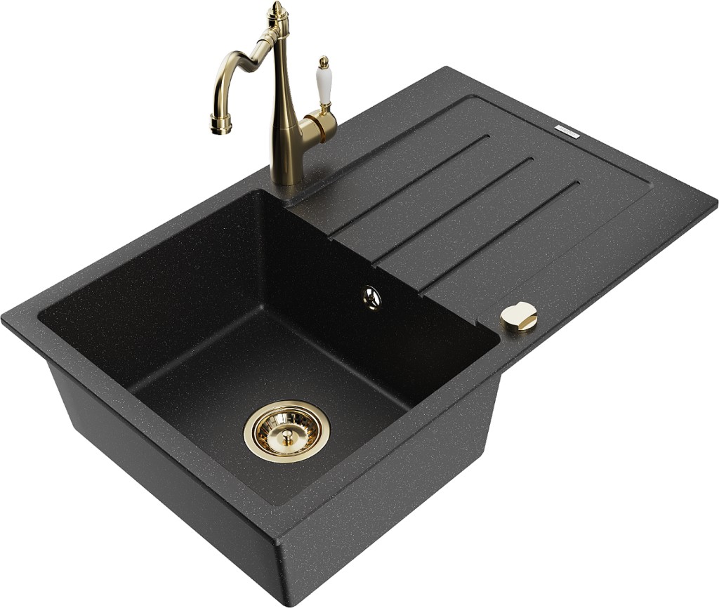 Technické dáta: drez: Rozmer: 795 x 495 x 200 mm Hĺbka komory: 200 mm Rozmery komory: 440x360 mm Priemer odtoku: ø90 mm Typ: 1-miska s odkvapkávačom Typ: Zapustené do pracovnej dosky Farba: čierna/strieborná metalíza Povrchová úprava sifónu: zlatá Materiál: žula (80% žulové kamenivo, 20% živice) Prepadový otvor: Áno Otvory: (batérie, automatické) 2 Inštalácia: Univerzálna, je možné inštalovať s odkvapkávačom na ľavú alebo pravú stranu Vysoká odolnosť proti poškriabaniu a zmene farby Odolnosť proti tepelným šokom Ľahko čistiteľný povrch Dva dodatočné vyfrézované otvory na samodierovanie ø35 kuchynská batéria: Materiál: mosadz Farba: Zlatá Hlava: Keramická Prevzdušňovač: Áno Typ: Jedna páka Výška batérie: 290 mm Rozsah výtoku: 260 mm(GT) Ean: 5905315040725
