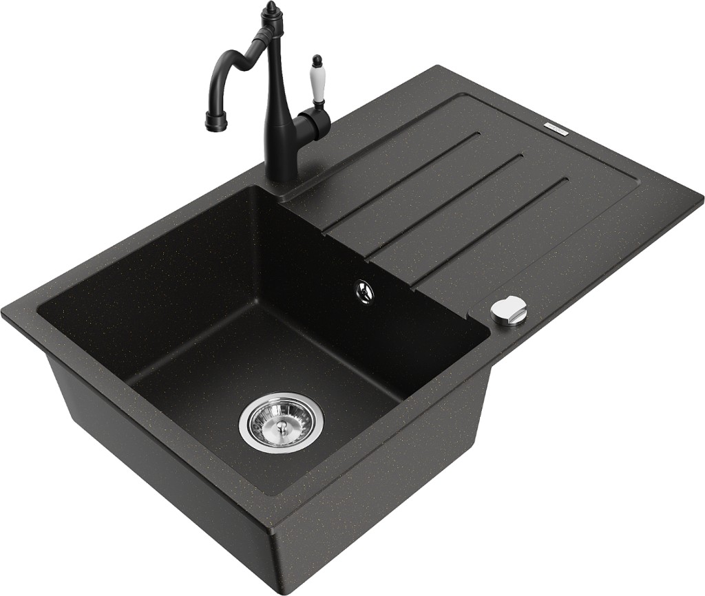 Technické dáta: drez: Rozmer: 795 x 495 x 200 mm Hĺbka komory: 200 mm Rozmery komory: 440x360 mm Priemer odtoku: ø90 mm Typ: 1-miska s odkvapkávačom Typ: Zapustené do pracovnej dosky Farba: čierna / zlatá metalíza Povrchová úprava sifónu: Chrome Materiál: žula (80% žulové kamenivo, 20% živice) Prepadový otvor: Áno Otvory: (batérie, automatické) 2 Inštalácia: Univerzálna, je možné inštalovať s odkvapkávačom na ľavú alebo pravú stranu Vysoká odolnosť proti poškriabaniu a zmene farby Odolnosť proti tepelným šokom Ľahko čistiteľný povrch Dva dodatočné vyfrézované otvory na samodierovanie ø35 kuchynská batéria: Materiál: mosadz Čierna farba Hlava: Keramická Prevzdušňovač: Áno Typ: Jedna páka Výška batérie: 290 mm Rozsah výtoku: 260 mm(GT) Ean: 5905315040794