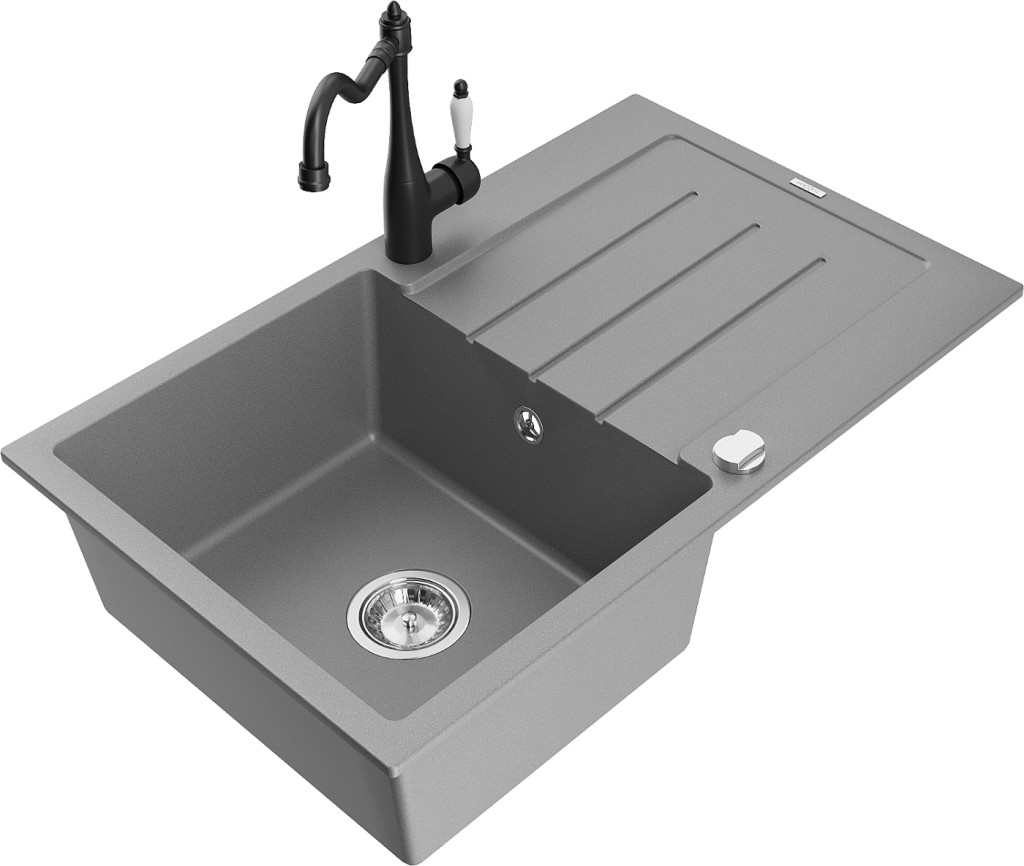 Technické dáta: drez: Rozmer: 795 x 495 x 200 mm Hĺbka komory: 200 mm Rozmery komory: 440x360 mm Priemer odtoku: ø90 mm Typ: 1-miska s odkvapkávačom Typ: Zapustené do pracovnej dosky Šedá farba Povrchová úprava sifónu: Chrome Materiál: žula (80% žulové kamenivo, 20% živice) Prepadový otvor: Áno Otvory: (batérie, automatické) 2 Inštalácia: Univerzálna, je možné inštalovať s odkvapkávačom na ľavú alebo pravú stranu Vysoká odolnosť proti poškriabaniu a zmene farby Odolnosť proti tepelným šokom Ľahko čistiteľný povrch Dva dodatočné vyfrézované otvory na samodierovanie ø35 kuchynská batéria: Materiál: mosadz Čierna farba Hlava: Keramická Prevzdušňovač: Áno Typ: Jedna páka Výška batérie: 290 mm Rozsah výtoku: 260 mm(GT) Ean: 5905315040688
