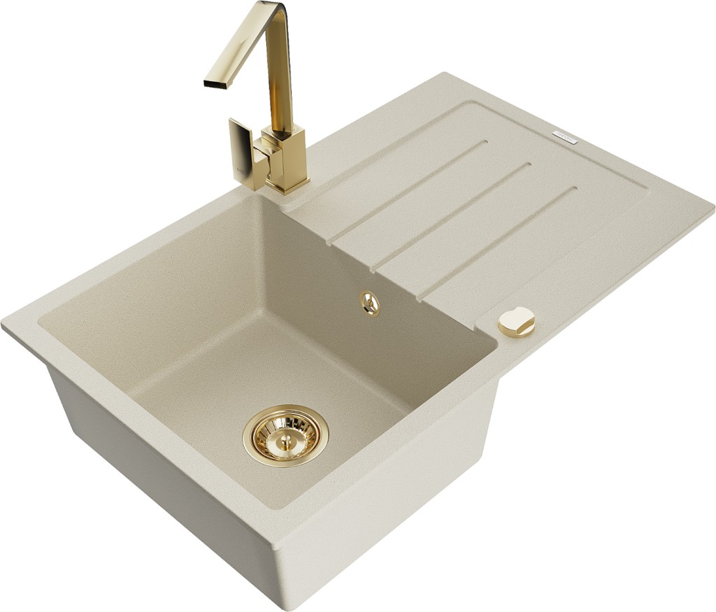 Technické dáta: drez: Rozmer: 795 x 495 x 200 mm Hĺbka komory: 200 mm Rozmery komory: 440x360 mm Priemer odtoku: ø90 mm Typ: 1-miska s odkvapkávačom Typ: Zapustené do pracovnej dosky Farba béžová Povrchová úprava sifónu: zlatá Materiál: žula (80% žulové kamenivo, 20% živice) Prepadový otvor: Áno Otvory: (batérie, automatické) 2 Inštalácia: Univerzálna, je možné inštalovať s odkvapkávačom na ľavú alebo pravú stranu Vysoká odolnosť proti poškriabaniu a zmene farby Odolnosť proti tepelným šokom Ľahko čistiteľný povrch Dva dodatočné vyfrézované otvory na samodierovanie ø35 kuchynská batéria: Materiál: mosadz Farba: Zlatá Hlava: Keramická Prevzdušňovač: Áno Typ: Jedna páka Výška batérie: 290 mm Rozsah výtoku: 220 mm (GT) Ean: 5905315020154
