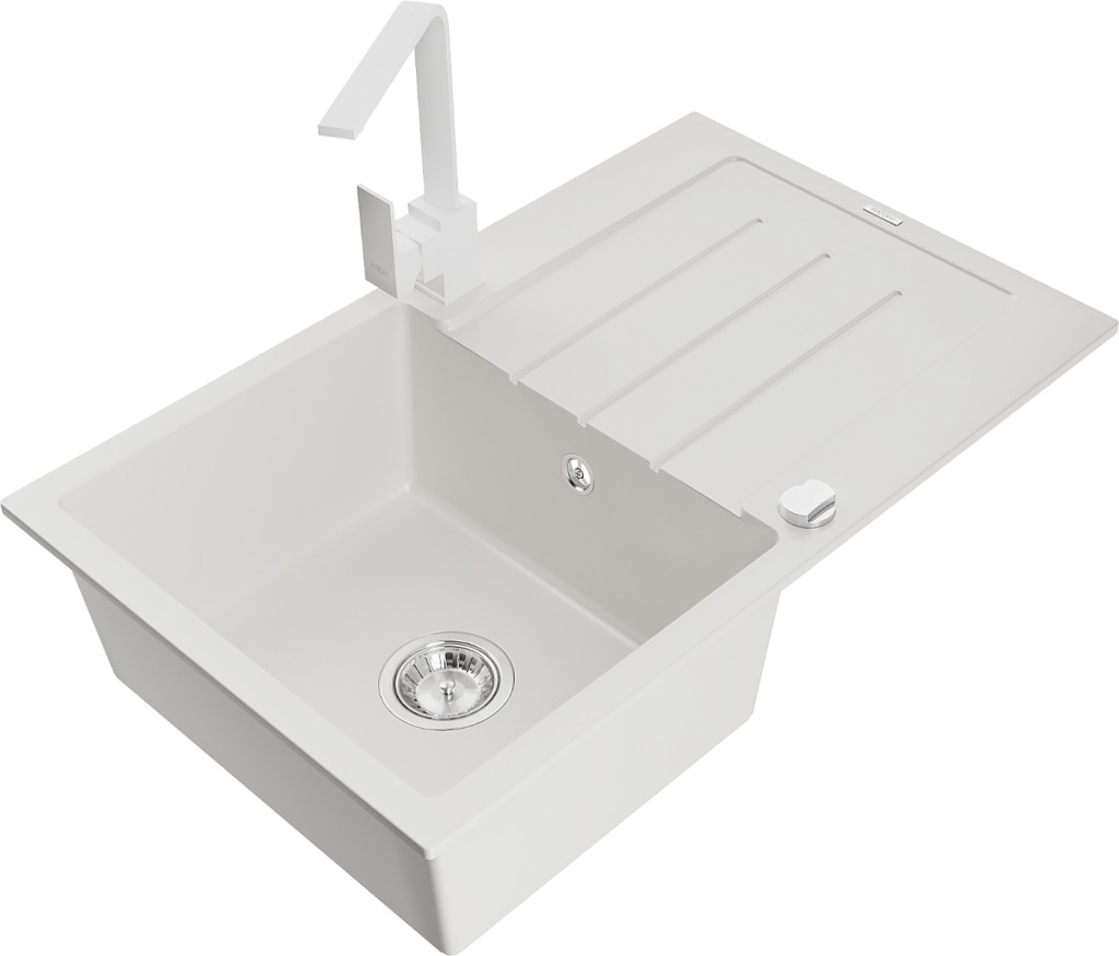 Technické dáta: drez: Rozmer: 795 x 495 x 200 mm Hĺbka komory: 200 mm Rozmery komory: 440x360 mm Priemer odtoku: ø90 mm Typ: 1-miska s odkvapkávačom Typ: Zapustené do pracovnej dosky biela farba Povrchová úprava sifónu: Chrome Materiál: žula (80% žulové kamenivo, 20% živice) Prepadový otvor: Áno Otvory: (batérie, automatické) 2 Inštalácia: Univerzálna, je možné inštalovať s odkvapkávačom na ľavú alebo pravú stranu Vysoká odolnosť proti poškriabaniu a zmene farby Odolnosť proti tepelným šokom Ľahko čistiteľný povrch Dva dodatočné vyfrézované otvory na samodierovanie ø35 kuchynská batéria: Materiál: mosadz biela farba Hlava: Keramická Prevzdušňovač: Áno Typ: Jedna páka Výška batérie: 290 mm Rozsah výtoku: 220 mm(GT) Ean: 5905315020109