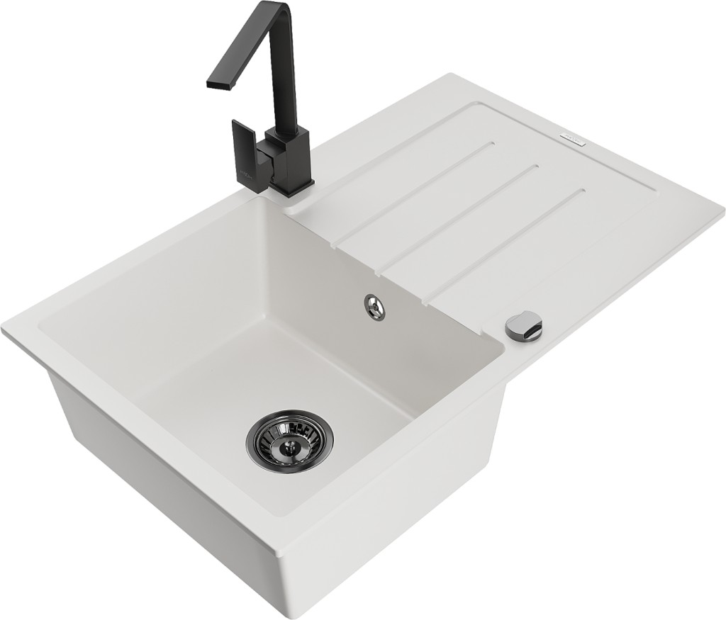 Technické dáta: drez: Rozmer: 795 x 495 x 200 mm Hĺbka komory: 200 mm Rozmery komory: 440x360 mm Priemer odtoku: ø90 mm Typ: 1-miska s odkvapkávačom Typ: Zapustené do pracovnej dosky biela farba Povrchová úprava sifónu: čierna Materiál: žula (80% žulové kamenivo, 20% živice) Prepadový otvor: Áno Otvory: (batérie, automatické) 2 Inštalácia: Univerzálna, je možné inštalovať s odkvapkávačom na ľavú alebo pravú stranu Vysoká odolnosť proti poškriabaniu a zmene farby Odolnosť proti tepelným šokom Ľahko čistiteľný povrch Dva dodatočné vyfrézované otvory na samodierovanie ø35 kuchynská batéria: Materiál: mosadz Čierna farba Hlava: Keramická Prevzdušňovač: Áno Typ: Jedna páka Výška batérie: 290 mm Rozsah výtoku: 220 mm(GT) Ean: 5905315020123