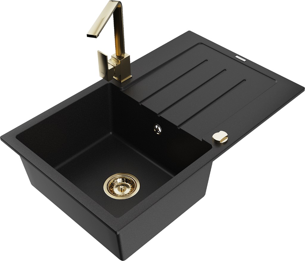 Technické dáta: drez: Rozmer: 795 x 495 x 200 mm Hĺbka komory: 200 mm Rozmery komory: 440x360 mm Priemer odtoku: ø90 mm Typ: 1-miska s odkvapkávačom Typ: Zapustené do pracovnej dosky Čierna farba Povrchová úprava sifónu: zlatá Materiál: žula (80% žulové kamenivo, 20% živice) Prepadový otvor: Áno Otvory: (batérie, automatické) 2 Inštalácia: Univerzálna, je možné inštalovať s odkvapkávačom na ľavú alebo pravú stranu Vysoká odolnosť proti poškriabaniu a zmene farby Odolnosť proti tepelným šokom Ľahko čistiteľný povrch Dva dodatočné vyfrézované otvory na samodierovanie ø35 kuchynská batéria: Materiál: mosadz Farba: Zlatá Hlava: Keramická Prevzdušňovač: Áno Typ: Jedna páka Výška batérie: 290 mm Rozsah výtoku: 220 mm(GT) Ean: 5905315020376
