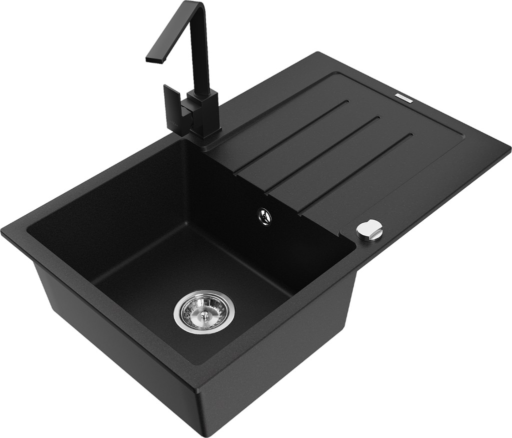 Technické dáta: drez: Rozmer: 795 x 495 x 200 mm Hĺbka komory: 200 mm Rozmery komory: 440x360 mm Priemer odtoku: ø90 mm Typ: 1-miska s odkvapkávačom Typ: Zapustené do pracovnej dosky Čierna farba Povrchová úprava sifónu: Chrome Materiál: žula (80% žulové kamenivo, 20% živice) Prepadový otvor: Áno Otvory: (batérie, automatické) 2 Inštalácia: Univerzálna, je možné inštalovať s odkvapkávačom na ľavú alebo pravú stranu Vysoká odolnosť proti poškriabaniu a zmene farby Odolnosť proti tepelným šokom Ľahko čistiteľný povrch Dva dodatočné vyfrézované otvory na samodierovanie ø35 kuchynská batéria: Materiál: mosadz Čierna farba Hlava: Keramická Prevzdušňovač: Áno Typ: Jedna páka Výška batérie: 290 mm Rozsah výtoku: 220 mm(GT) Ean: 5905315020406