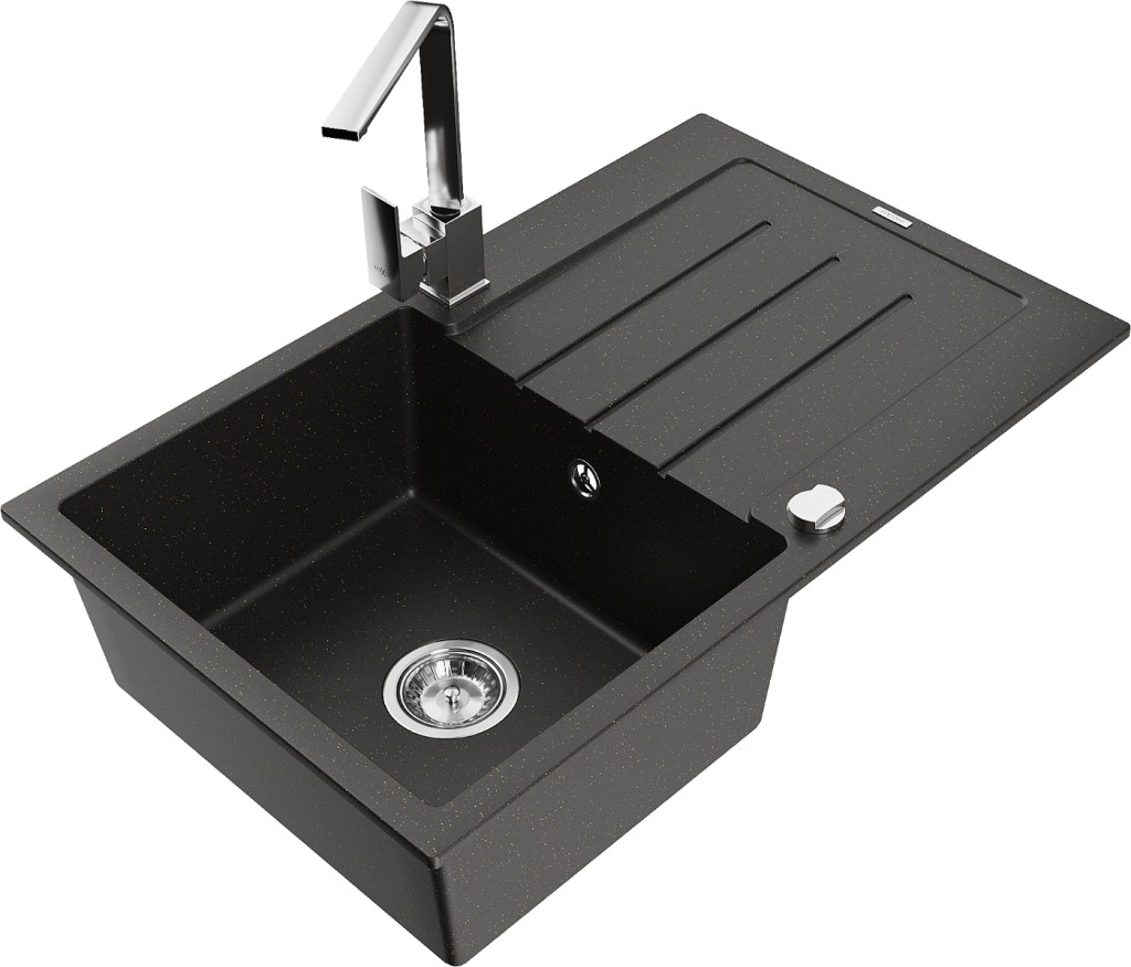 Technické dáta: drez: Rozmer: 795 x 495 x 200 mm Hĺbka komory: 200 mm Rozmery komory: 440x360 mm Priemer odtoku: ø90 mm Typ: 1-miska s odkvapkávačom Typ: Zapustené do pracovnej dosky Farba: čierna / zlatá metalíza Povrchová úprava sifónu: Chrome Materiál: žula (80% žulové kamenivo, 20% živice) Prepadový otvor: Áno Otvory: (batérie, automatické) 2 Inštalácia: Univerzálna, je možné inštalovať s odkvapkávačom na ľavú alebo pravú stranu Vysoká odolnosť proti poškriabaniu a zmene farby Odolnosť proti tepelným šokom Ľahko čistiteľný povrch Dva dodatočné vyfrézované otvory na samodierovanie ø35 kuchynská batéria: Materiál: mosadz Farba: Chrome Hlava: Keramická Prevzdušňovač: Áno Typ: Jedna páka Výška batérie: 290 mm Rozsah výtoku: 220 mm(GT) Ean: 5905315020253