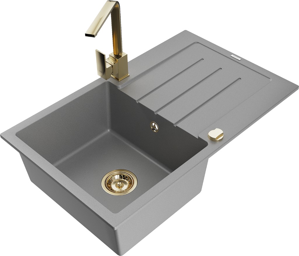 Technické dáta: drez: Rozmer: 795 x 495 x 200 mm Hĺbka komory: 200 mm Rozmery komory: 440x360 mm Priemer odtoku: ø90 mm Typ: 1-miska s odkvapkávačom Typ: Zapustené do pracovnej dosky Šedá farba Povrchová úprava sifónu: zlatá Materiál: žula (80% žulové kamenivo, 20% živice) Prepadový otvor: Áno Otvory: (batérie, automatické) 2 Inštalácia: Univerzálna, je možné inštalovať s odkvapkávačom na ľavú alebo pravú stranu Vysoká odolnosť proti poškriabaniu a zmene farby Odolnosť proti tepelným šokom Ľahko čistiteľný povrch Dva dodatočné vyfrézované otvory na samodierovanie ø35 kuchynská batéria: Materiál: mosadz Farba: Zlatá Hlava: Keramická Prevzdušňovač: Áno Typ: Jedna páka Výška batérie: 290 mm Rozsah výtoku: 220 mm(GT) Ean: 5905315020185