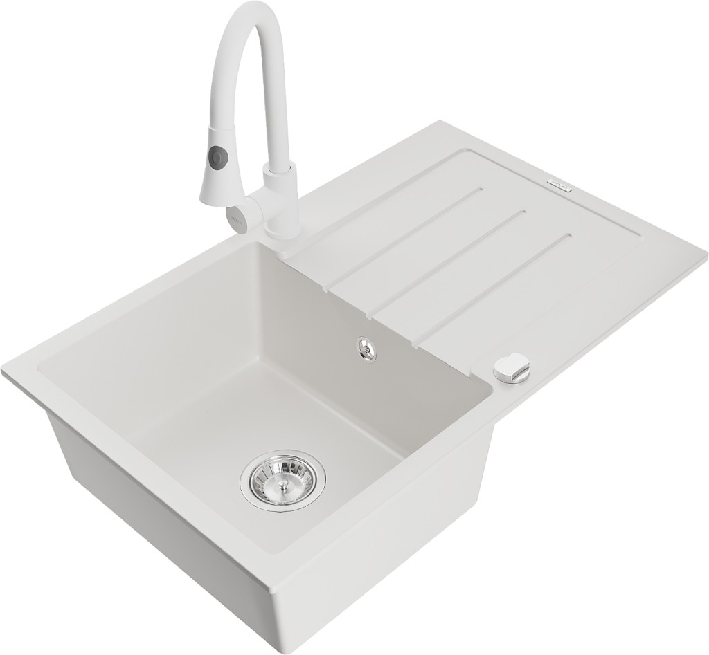 Technické dáta: drez: Rozmer: 795 x 495 x 200 mm Hĺbka komory: 200 mm Rozmery komory: 440x360 mm Priemer odtoku: ø90 mm Typ: 1-miska s odkvapkávačom Typ: Zapustené do pracovnej dosky biela farba Povrchová úprava sifónu: Chrome Materiál: žula (80% žulové kamenivo, 20% živice) Prepadový otvor: Áno Otvory: (batérie, automatické) 2 Inštalácia: Univerzálna, je možné inštalovať s odkvapkávačom na ľavú alebo pravú stranu Vysoká odolnosť proti poškriabaniu a zmene farby Odolnosť proti tepelným šokom Ľahko čistiteľný povrch Dva dodatočné vyfrézované otvory na samodierovanie ø35 kuchynská batéria: Materiál: mosadz biela farba Hlava: Keramická Prevzdušňovač: Áno Typ: Jedna páka Výška batérie: 380 mm Rozsah výtoku: 252 mm Typ výtoku: Výsuvný(GT) Ean: 5905315030344