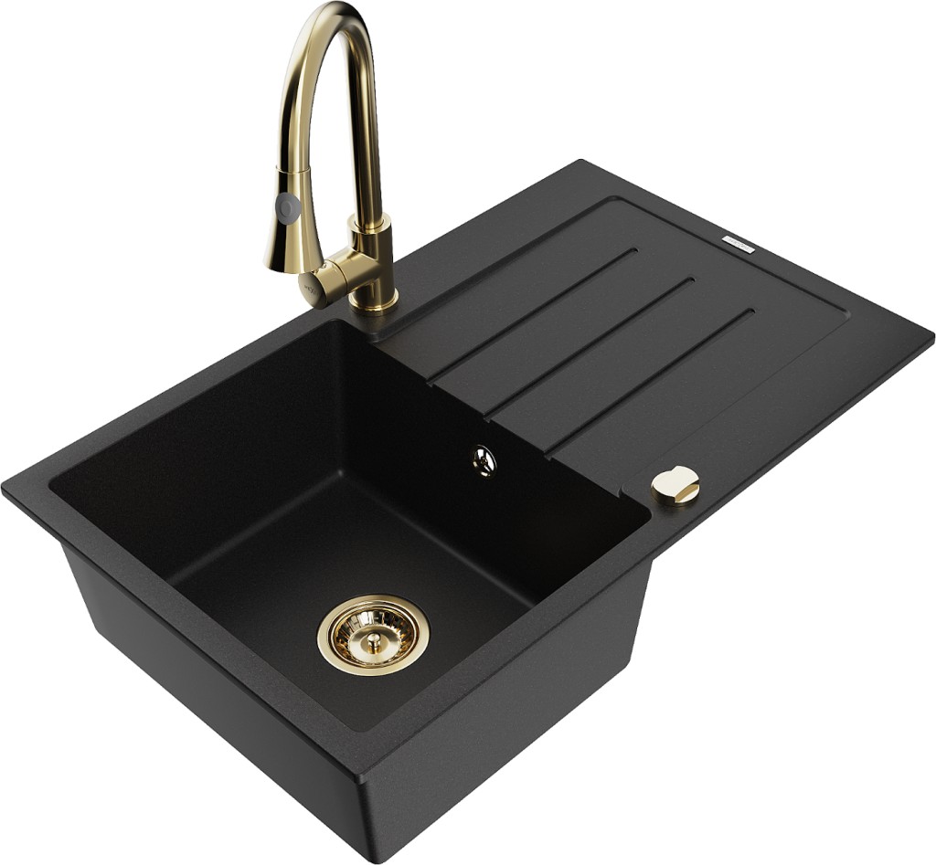 Technické dáta: drez: Rozmer: 795 x 495 x 200 mm Hĺbka komory: 200 mm Rozmery komory: 440x360 mm Priemer odtoku: ø90 mm Typ: 1-miska s odkvapkávačom Typ: Zapustené do pracovnej dosky Čierna farba Povrchová úprava sifónu: zlatá Materiál: žula (80% žulové kamenivo, 20% živice) Prepadový otvor: Áno Otvory: (batérie, automatické) 2 Inštalácia: Univerzálna, je možné inštalovať s odkvapkávačom na ľavú alebo pravú stranu Vysoká odolnosť proti poškriabaniu a zmene farby Odolnosť proti tepelným šokom Ľahko čistiteľný povrch Dva dodatočné vyfrézované otvory na samodierovanie ø35 kuchynská batéria: Materiál: mosadz Farba: Zlatá Hlava: Keramická Prevzdušňovač: Áno Typ: Jedna páka Výška batérie: 380 mm Rozsah výtoku: 252 mm Typ výtoku: Výsuvný(GT) Ean: 5905315030610