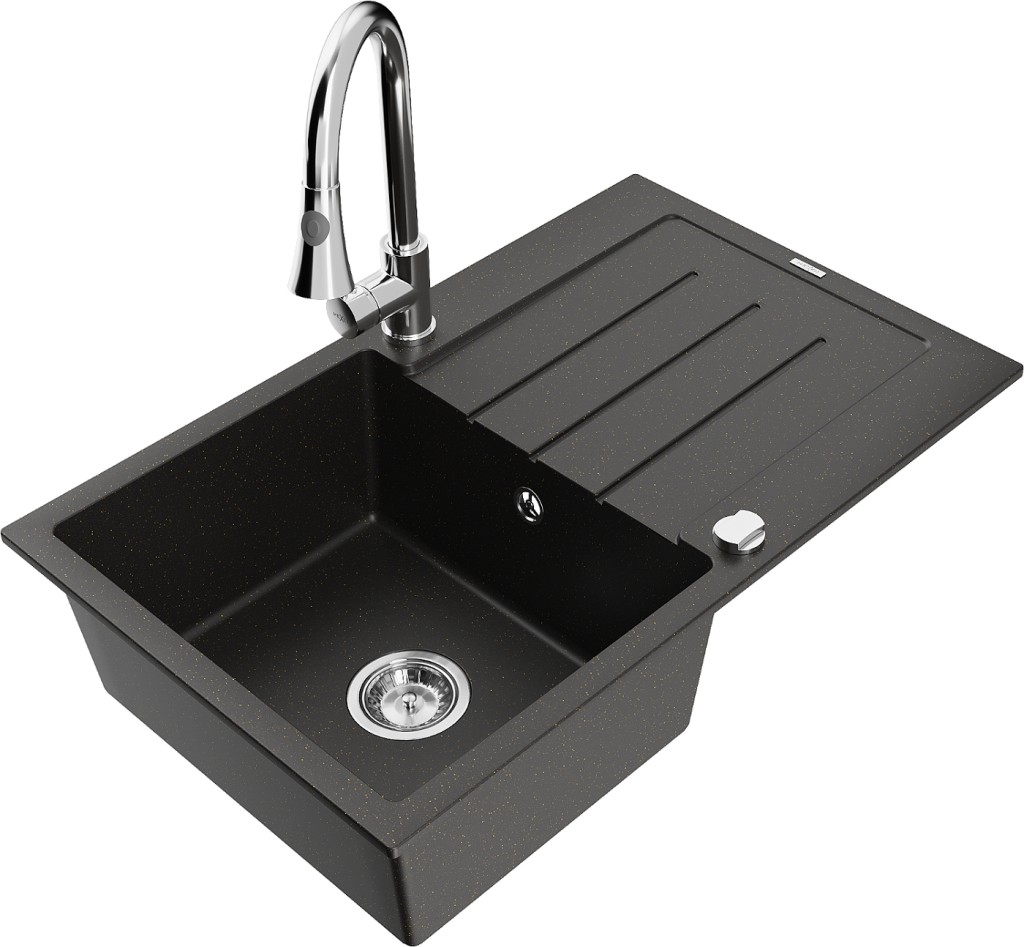 Technické dáta: drez: Rozmer: 795 x 495 x 200 mm Hĺbka komory: 200 mm Rozmery komory: 440x360 mm Priemer odtoku: ø90 mm Typ: 1-miska s odkvapkávačom Typ: Zapustené do pracovnej dosky Farba: čierna / zlatá metalíza Povrchová úprava sifónu: Chrome Materiál: žula (80% žulové kamenivo, 20% živice) Prepadový otvor: Áno Otvory: (batérie, automatické) 2 Inštalácia: Univerzálna, je možné inštalovať s odkvapkávačom na ľavú alebo pravú stranu Vysoká odolnosť proti poškriabaniu a zmene farby Odolnosť proti tepelným šokom Ľahko čistiteľný povrch Dva dodatočné vyfrézované otvory na samodierovanie ø35 kuchynská batéria: Materiál: mosadz Farba: Chrome Hlava: Keramická Prevzdušňovač: Áno Typ: Jedna páka Výška batérie: 380 mm Rozsah výtoku: 252 mm Typ výtoku: Výsuvný(GT) Ean: 5905315030498