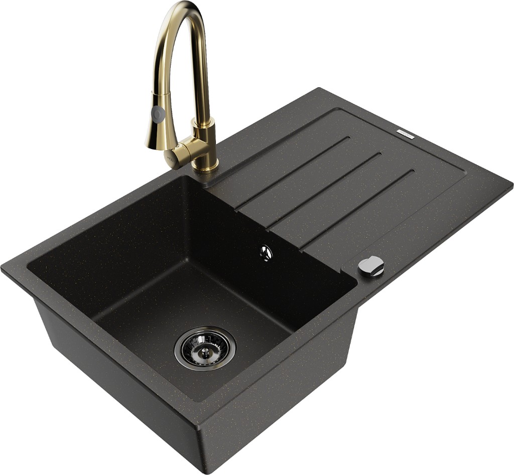 Technické dáta: drez: Rozmer: 795 x 495 x 200 mm Hĺbka komory: 200 mm Rozmery komory: 440x360 mm Priemer odtoku: ø90 mm Typ: 1-miska s odkvapkávačom Typ: Zapustené do pracovnej dosky Farba: čierna / zlatá metalíza Povrchová úprava sifónu: čierna Materiál: žula (80% žulové kamenivo, 20% živice) Prepadový otvor: Áno Otvory: (batérie, automatické) 2 Inštalácia: Univerzálna, je možné inštalovať s odkvapkávačom na ľavú alebo pravú stranu Vysoká odolnosť proti poškriabaniu a zmene farby Odolnosť proti tepelným šokom Ľahko čistiteľný povrch Dva dodatočné vyfrézované otvory na samodierovanie ø35 kuchynská batéria: Materiál: mosadz Farba: Zlatá Hlava: Keramická Prevzdušňovač: Áno Typ: Jedna páka Výška batérie: 380 mm Rozsah výtoku: 252 mm Typ výtoku: Výsuvný(GT) Ean: 5905315030528