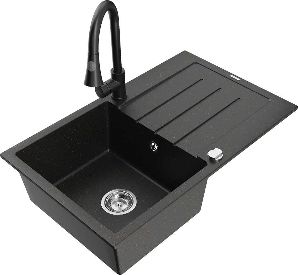 Technické dáta: drez: Rozmer: 795 x 495 x 200 mm Hĺbka komory: 200 mm Rozmery komory: 440x360 mm Priemer odtoku: ø90 mm Typ: 1-miska s odkvapkávačom Typ: Zapustené do pracovnej dosky Farba: čierna / zlatá metalíza Povrchová úprava sifónu: Chrome Materiál: žula (80% žulové kamenivo, 20% živice) Prepadový otvor: Áno Otvory: (batérie, automatické) 2 Inštalácia: Univerzálna, je možné inštalovať s odkvapkávačom na ľavú alebo pravú stranu Vysoká odolnosť proti poškriabaniu a zmene farby Odolnosť proti tepelným šokom Ľahko čistiteľný povrch Dva dodatočné vyfrézované otvory na samodierovanie ø35 kuchynská batéria: Materiál: mosadz Čierna farba Hlava: Keramická Prevzdušňovač: Áno Typ: Jedna páka Výška batérie: 380 mm Rozsah výtoku: 252 mm Typ výtoku: Výsuvný(GT) Ean: 5905315030542