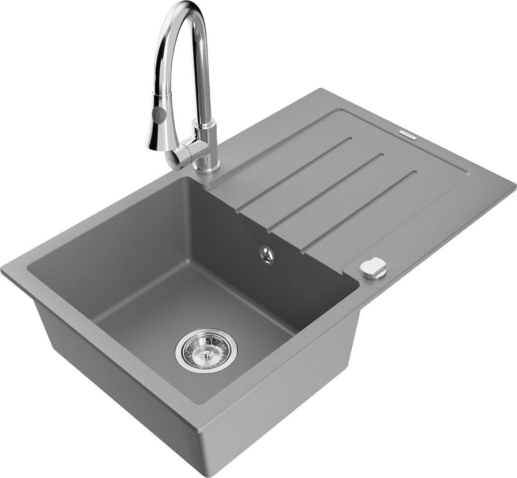 Technické dáta: drez: Rozmer: 795 x 495 x 200 mm Hĺbka komory: 200 mm Rozmery komory: 440x360 mm Priemer odtoku: ø90 mm Typ: 1-miska s odkvapkávačom Typ: Zapustené do pracovnej dosky Šedá farba Povrchová úprava sifónu: Chrome Materiál: žula (80% žulové kamenivo, 20% živice) Prepadový otvor: Áno Otvory: (batérie, automatické) 2 Inštalácia: Univerzálna, je možné inštalovať s odkvapkávačom na ľavú alebo pravú stranu Vysoká odolnosť proti poškriabaniu a zmene farby Odolnosť proti tepelným šokom Ľahko čistiteľný povrch Dva dodatočné vyfrézované otvory na samodierovanie ø35 kuchynská batéria: Materiál: mosadz Farba: Chrome Hlava: Keramická Prevzdušňovač: Áno Typ: Jedna páka Výška batérie: 380 mm Rozsah výtoku: 252 mm Typ výtoku: Výsuvný(GT) Ean: 5905315030412