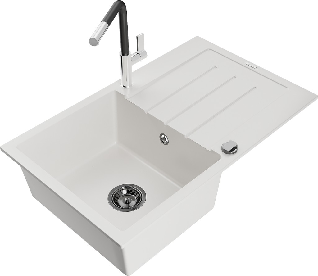 Technické dáta: drez: Rozmer: 795 x 495 x 200 mm Hĺbka komory: 200 mm Rozmery komory: 440x360 mm Priemer odtoku: ø90 mm Typ: 1-miska s odkvapkávačom Typ: Zapustené do pracovnej dosky biela farba Povrchová úprava sifónu: čierna Materiál: žula (80% žulové kamenivo, 20% živice) Prepadový otvor: Áno Otvory: (batérie, automatické) 2 Inštalácia: Univerzálna, je možné inštalovať s odkvapkávačom na ľavú alebo pravú stranu Vysoká odolnosť proti poškriabaniu a zmene farby Odolnosť proti tepelným šokom Ľahko čistiteľný povrch Dva dodatočné vyfrézované otvory na samodierovanie ø35 kuchynská batéria: Materiál: mosadz Farba: chróm/čierna Hlava: Keramická Prevzdušňovač: Áno Typ: Jedna páka Rozsah výtoku: 245 mm Výška batérie: 307 mm(GT) Ean: 5905315060990