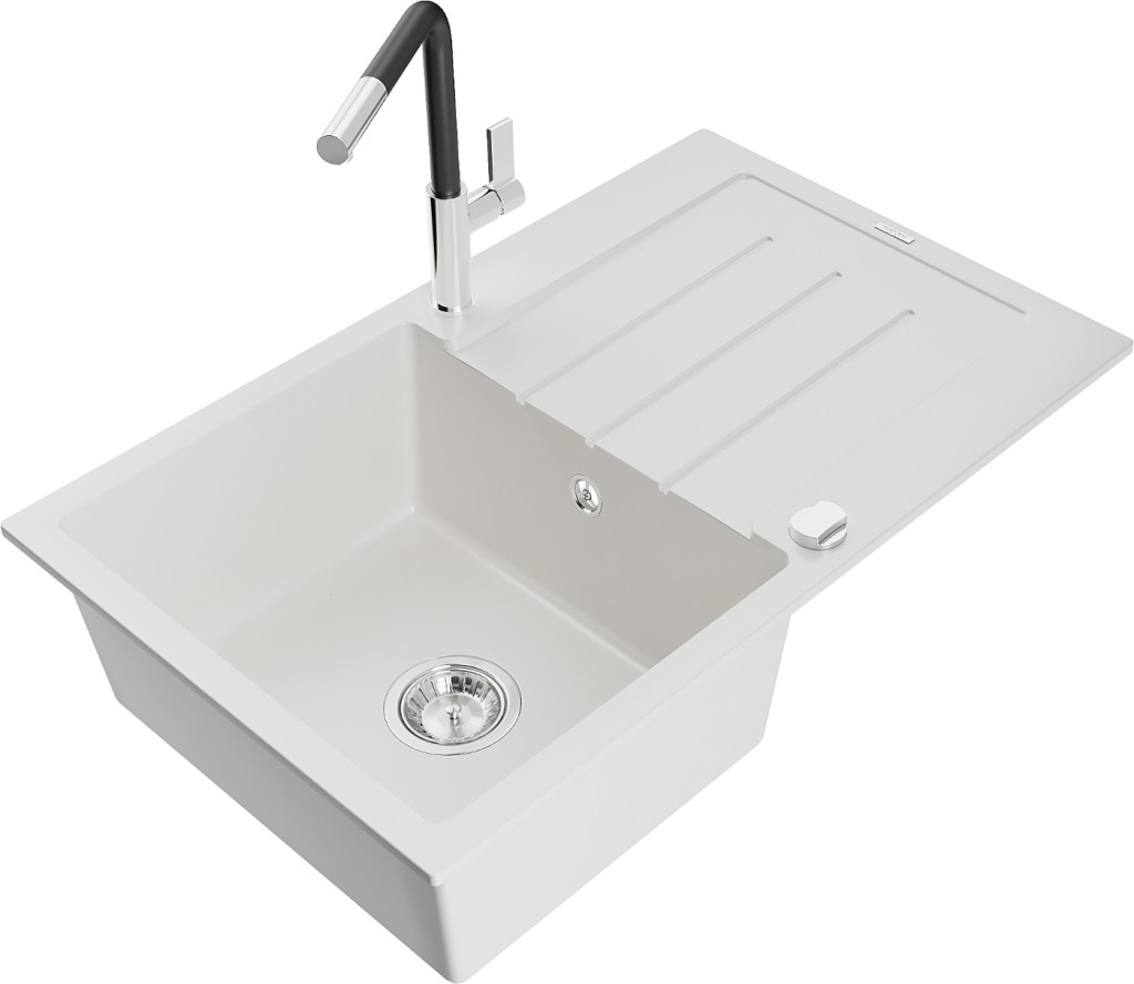 Technické dáta: drez: Rozmer: 795 x 495 x 200 mm Hĺbka komory: 200 mm Rozmery komory: 440x360 mm Priemer odtoku: ø90 mm Typ: 1-miska s odkvapkávačom Typ: Zapustené do pracovnej dosky biela farba Povrchová úprava sifónu: Chrome Materiál: žula (80% žulové kamenivo, 20% živice) Prepadový otvor: Áno Otvory: (batérie, automatické) 2 Inštalácia: Univerzálna, je možné inštalovať s odkvapkávačom na ľavú alebo pravú stranu Vysoká odolnosť proti poškriabaniu a zmene farby Odolnosť proti tepelným šokom Ľahko čistiteľný povrch Dva dodatočné vyfrézované otvory na samodierovanie ø35 kuchynská batéria: Materiál: mosadz Farba: chróm/čierna Hlava: Keramická Prevzdušňovač: Áno Typ: Jedna páka Rozsah výtoku: 245 mm Výška batérie: 307 mm(GT) Ean: 5905315060983