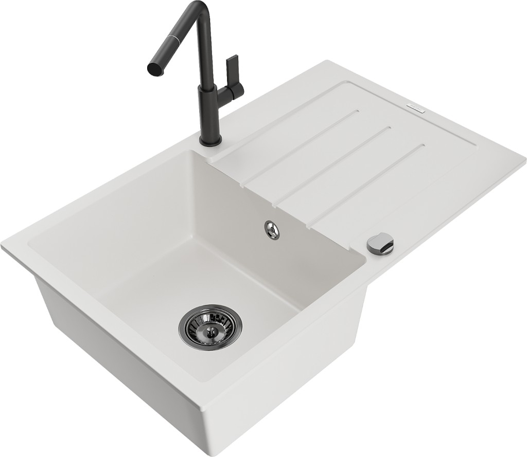 Technické dáta: drez: Rozmer: 795 x 495 x 200 mm Hĺbka komory: 200 mm Rozmery komory: 440x360 mm Priemer odtoku: ø90 mm Typ: 1-miska s odkvapkávačom Typ: Zapustené do pracovnej dosky biela farba Povrchová úprava sifónu: čierna Materiál: žula (80% žulové kamenivo, 20% živice) Prepadový otvor: Áno Otvory: (batérie, automatické) 2 Inštalácia: Univerzálna, je možné inštalovať s odkvapkávačom na ľavú alebo pravú stranu Vysoká odolnosť proti poškriabaniu a zmene farby Odolnosť proti tepelným šokom Ľahko čistiteľný povrch Dva dodatočné vyfrézované otvory na samodierovanie ø35 kuchynská batéria: Materiál: mosadz Čierna farba Hlava: Keramická Prevzdušňovač: Áno Typ: Jedna páka Rozsah výtoku: 245 mm Výška batérie: 307 mm(GT) Ean: 5905315061027