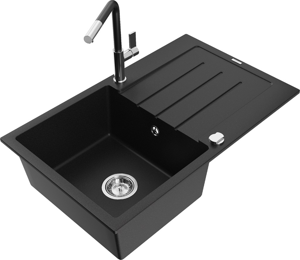 Technické dáta: drez: Rozmer: 795 x 495 x 200 mm Hĺbka komory: 200 mm Rozmery komory: 440x360 mm Priemer odtoku: ø90 mm Typ: 1-miska s odkvapkávačom Typ: Zapustené do pracovnej dosky Čierna farba Povrchová úprava sifónu: Chrome Materiál: žula (80% žulové kamenivo, 20% živice) Prepadový otvor: Áno Otvory: (batérie, automatické) 2 Inštalácia: Univerzálna, je možné inštalovať s odkvapkávačom na ľavú alebo pravú stranu Vysoká odolnosť proti poškriabaniu a zmene farby Odolnosť proti tepelným šokom Ľahko čistiteľný povrch Dva dodatočné vyfrézované otvory na samodierovanie ø35 kuchynská batéria: Materiál: mosadz Farba: chróm/čierna Hlava: Keramická Prevzdušňovač: Áno Typ: Jedna páka Rozsah výtoku: 245 mm Výška batérie: 307 mm(GT) Ean: 5905315061409