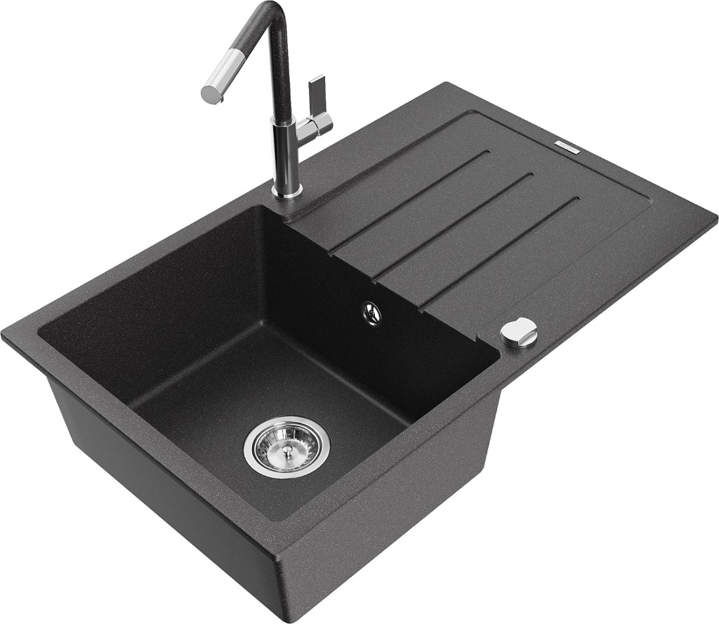 Technické dáta: drez: Rozmer: 795 x 495 x 200 mm Hĺbka komory: 200 mm Rozmery komory: 440x360 mm Priemer odtoku: ø90 mm Typ: 1-miska s odkvapkávačom Typ: Zapustené do pracovnej dosky Farba: Škvrnitá čierna Povrchová úprava sifónu: Chrome Materiál: žula (80% žulové kamenivo, 20% živice) Prepadový otvor: Áno Otvory: (batérie, automatické) 2 Inštalácia: Univerzálna, je možné inštalovať s odkvapkávačom na ľavú alebo pravú stranu Vysoká odolnosť proti poškriabaniu a zmene farby Odolnosť proti tepelným šokom Ľahko čistiteľný povrch Dva dodatočné vyfrézované otvory na samodierovanie ø35 kuchynská batéria: Materiál: mosadz Farba: chróm/čierna škvrnitá Hlava: Keramická Prevzdušňovač: Áno Typ: Jedna páka Rozsah výtoku: 245 mm Výška batérie: 307 mm(GT) Ean: 5905315061324