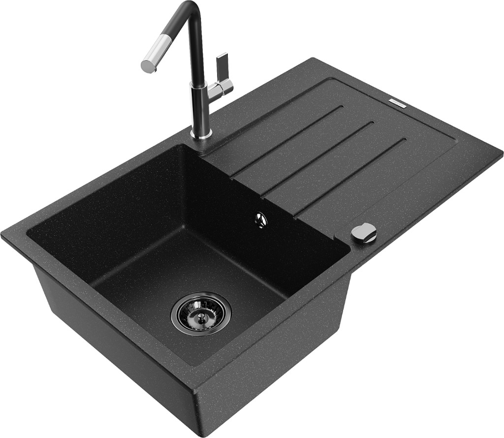Technické dáta: drez: Rozmer: 795 x 495 x 200 mm Hĺbka komory: 200 mm Rozmery komory: 440x360 mm Priemer odtoku: ø90 mm Typ: 1-miska s odkvapkávačom Typ: Zapustené do pracovnej dosky Farba: čierna/strieborná metalíza Povrchová úprava sifónu: čierna Materiál: žula (80% žulové kamenivo, 20% živice) Prepadový otvor: Áno Otvory: (batérie, automatické) 2 Inštalácia: Univerzálna, je možné inštalovať s odkvapkávačom na ľavú alebo pravú stranu Vysoká odolnosť proti poškriabaniu a zmene farby Odolnosť proti tepelným šokom Ľahko čistiteľný povrch Dva dodatočné vyfrézované otvory na samodierovanie ø35 kuchynská batéria: Materiál: mosadz Farba: chróm/čierna Hlava: Keramická Prevzdušňovač: Áno Typ: Jedna páka Rozsah výtoku: 245 mm Výška batérie: 307 mm(GT) Ean: 5905315061195