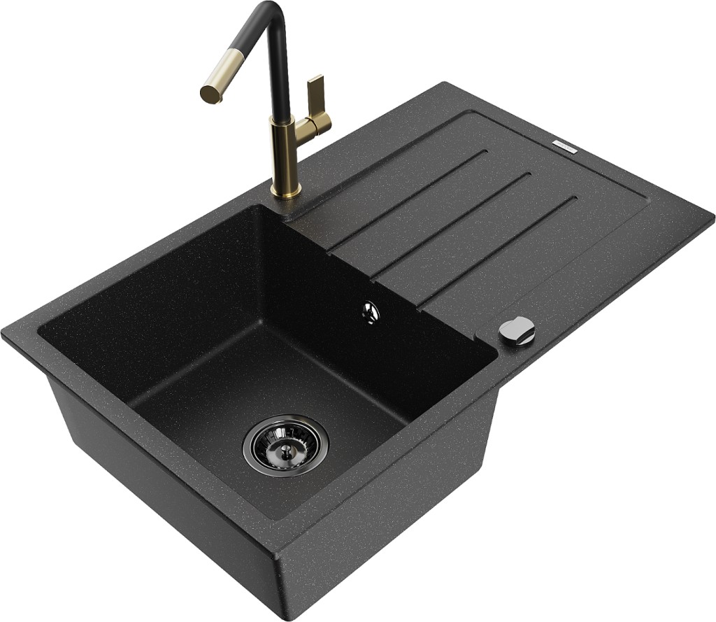 Technické dáta: drez: Rozmer: 795 x 495 x 200 mm Hĺbka komory: 200 mm Rozmery komory: 440x360 mm Priemer odtoku: ø90 mm Typ: 1-miska s odkvapkávačom Typ: Zapustené do pracovnej dosky Farba: čierna/strieborná metalíza Povrchová úprava sifónu: čierna Materiál: žula (80% žulové kamenivo, 20% živice) Prepadový otvor: Áno Otvory: (batérie, automatické) 2 Inštalácia: Univerzálna, je možné inštalovať s odkvapkávačom na ľavú alebo pravú stranu Vysoká odolnosť proti poškriabaniu a zmene farby Odolnosť proti tepelným šokom Ľahko čistiteľný povrch Dva dodatočné vyfrézované otvory na samodierovanie ø35 kuchynská batéria: Materiál: mosadz Farba: Zlatá/Čierna Hlava: Keramická Prevzdušňovač: Áno Typ: Jedna páka Rozsah výtoku: 245 mm Výška batérie: 307 mm(GT) Ean: 5905315061218