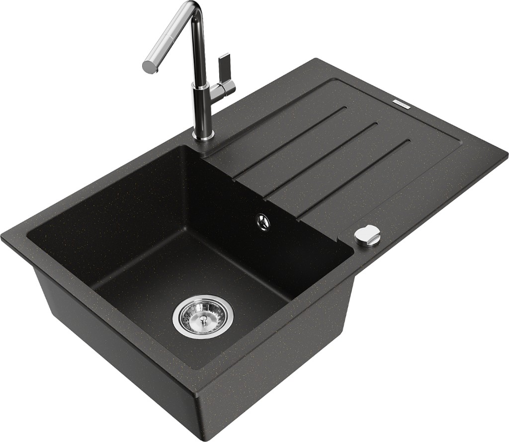 Technické dáta: drez: Rozmer: 795 x 495 x 200 mm Hĺbka komory: 200 mm Rozmery komory: 440x360 mm Priemer odtoku: ø90 mm Typ: 1-miska s odkvapkávačom Typ: Zapustené do pracovnej dosky Farba: čierna / zlatá metalíza Povrchová úprava sifónu: Chrome Materiál: žula (80% žulové kamenivo, 20% živice) Prepadový otvor: Áno Otvory: (batérie, automatické) 2 Inštalácia: Univerzálna, je možné inštalovať s odkvapkávačom na ľavú alebo pravú stranu Vysoká odolnosť proti poškriabaniu a zmene farby Odolnosť proti tepelným šokom Ľahko čistiteľný povrch Dva dodatočné vyfrézované otvory na samodierovanie ø35 kuchynská batéria: Materiál: mosadz Farba: Chrome Hlava: Keramická Prevzdušňovač: Áno Typ: Jedna páka Rozsah výtoku: 245 mm Výška batérie: 307 mm(GT) Ean: 5905315061232