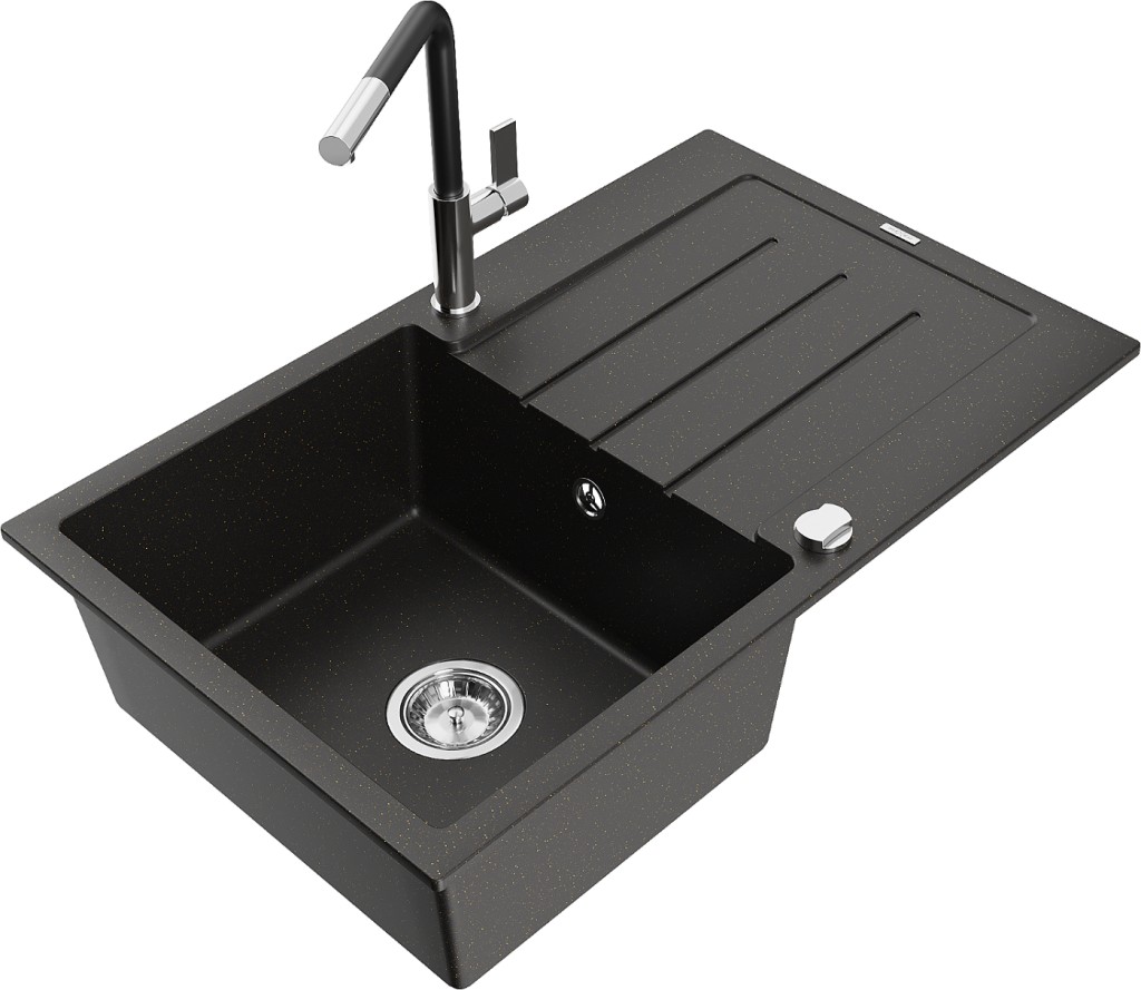 Technické dáta: drez: Rozmer: 795 x 495 x 200 mm Hĺbka komory: 200 mm Rozmery komory: 440x360 mm Priemer odtoku: ø90 mm Typ: 1-miska s odkvapkávačom Typ: Zapustené do pracovnej dosky Farba: čierna / zlatá metalíza Povrchová úprava sifónu: Chrome Materiál: žula (80% žulové kamenivo, 20% živice) Prepadový otvor: Áno Otvory: (batérie, automatické) 2 Inštalácia: Univerzálna, je možné inštalovať s odkvapkávačom na ľavú alebo pravú stranu Vysoká odolnosť proti poškriabaniu a zmene farby Odolnosť proti tepelným šokom Ľahko čistiteľný povrch Dva dodatočné vyfrézované otvory na samodierovanie ø35 kuchynská batéria: Materiál: mosadz Farba: chróm/čierna Hlava: Keramická Prevzdušňovač: Áno Typ: Jedna páka Rozsah výtoku: 245 mm Výška batérie: 307 mm(GT) Ean: 5905315061249