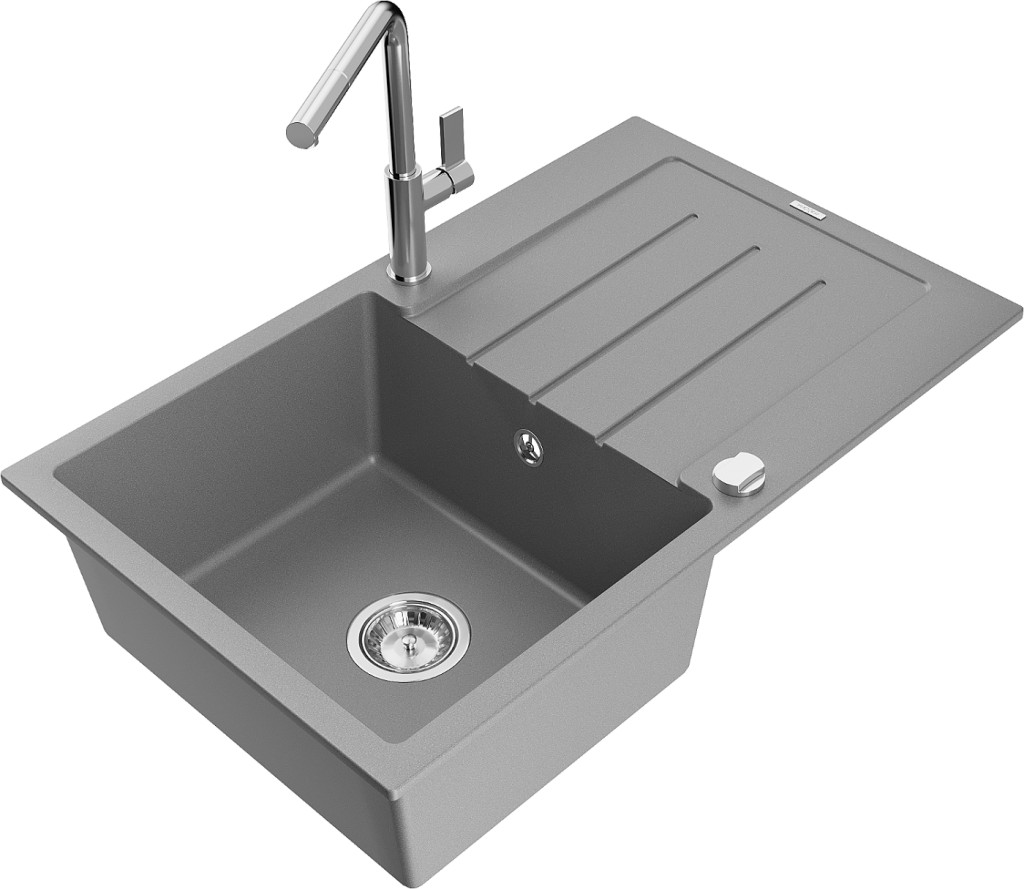 Technické dáta: drez: Rozmer: 795 x 495 x 200 mm Hĺbka komory: 200 mm Rozmery komory: 440x360 mm Priemer odtoku: ø90 mm Typ: 1-miska s odkvapkávačom Typ: Zapustené do pracovnej dosky Šedá farba Povrchová úprava sifónu: Chrome Materiál: žula (80% žulové kamenivo, 20% živice) Prepadový otvor: Áno Otvory: (batérie, automatické) 2 Inštalácia: Univerzálna, je možné inštalovať s odkvapkávačom na ľavú alebo pravú stranu Vysoká odolnosť proti poškriabaniu a zmene farby Odolnosť proti tepelným šokom Ľahko čistiteľný povrch Dva dodatočné vyfrézované otvory na samodierovanie ø35 kuchynská batéria: Materiál: mosadz Farba: Chrome Hlava: Keramická Prevzdušňovač: Áno Typ: Jedna páka Rozsah výtoku: 245 mm Výška batérie: 307 mm(GT) Ean: 5905315061102