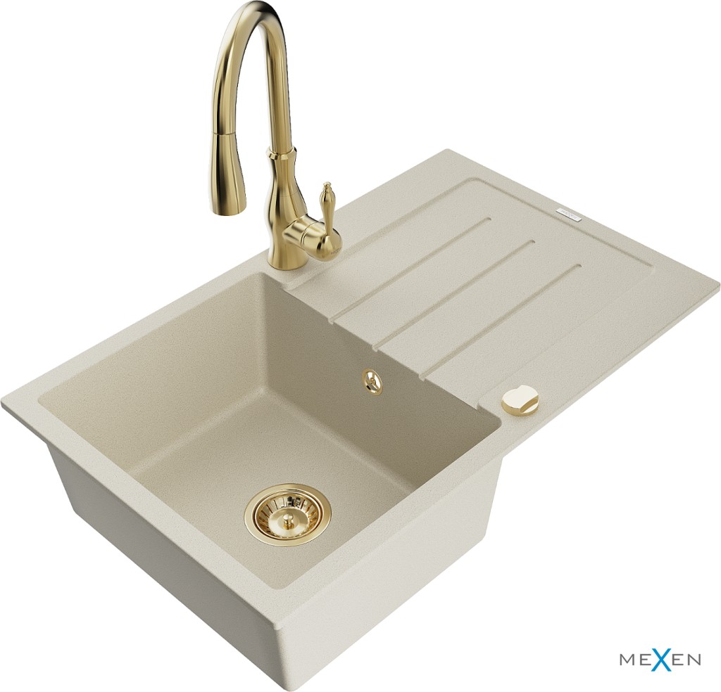 Technické dáta: drez: Rozmer: 795 x 495 x 200 mm Hĺbka komory: 200 mm Rozmery komory: 440x360 mm Priemer odtoku: ø90 mm Typ: 1-miska s odkvapkávačom Typ: Zapustené do pracovnej dosky Farba béžová Povrchová úprava sifónu: zlatá Materiál: žula (80% žulové kamenivo, 20% živice) Prepadový otvor: Áno Otvory: (batérie, automatické) 2 Inštalácia: Univerzálna, je možné inštalovať s odkvapkávačom na ľavú alebo pravú stranu Vysoká odolnosť proti poškriabaniu a zmene farby Odolnosť proti tepelným šokom Ľahko čistiteľný povrch Dva dodatočné vyfrézované otvory na samodierovanie ø35 kuchynská batéria: Materiál: mosadz Farba: Zlatá Hlava: Keramická Prevzdušňovač: Áno Typ: Jedna páka Výška batérie: 410 mm Rozsah výtoku: 231 mm(GT) Ean: 5905315035509