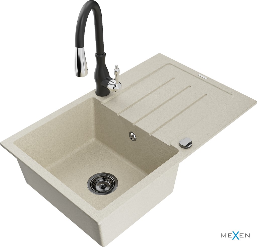 Technické dáta: drez: Rozmer: 795 x 495 x 200 mm Hĺbka komory: 200 mm Rozmery komory: 440x360 mm Priemer odtoku: ø90 mm Typ: 1-miska s odkvapkávačom Typ: Zapustené do pracovnej dosky Farba béžová Povrchová úprava sifónu: čierna Materiál: žula (80% žulové kamenivo, 20% živice) Prepadový otvor: Áno Otvory: (batérie, automatické) 2 Inštalácia: Univerzálna, je možné inštalovať s odkvapkávačom na ľavú alebo pravú stranu Vysoká odolnosť proti poškriabaniu a zmene farby Odolnosť proti tepelným šokom Ľahko čistiteľný povrch Dva dodatočné vyfrézované otvory na samodierovanie ø35 kuchynská batéria: Materiál: mosadz Čierna farba Hlava: Keramická Prevzdušňovač: Áno Typ: Jedna páka Výška batérie: 410 mm Rozsah výtoku: 231 mm(GT) Ean: 5905315035516