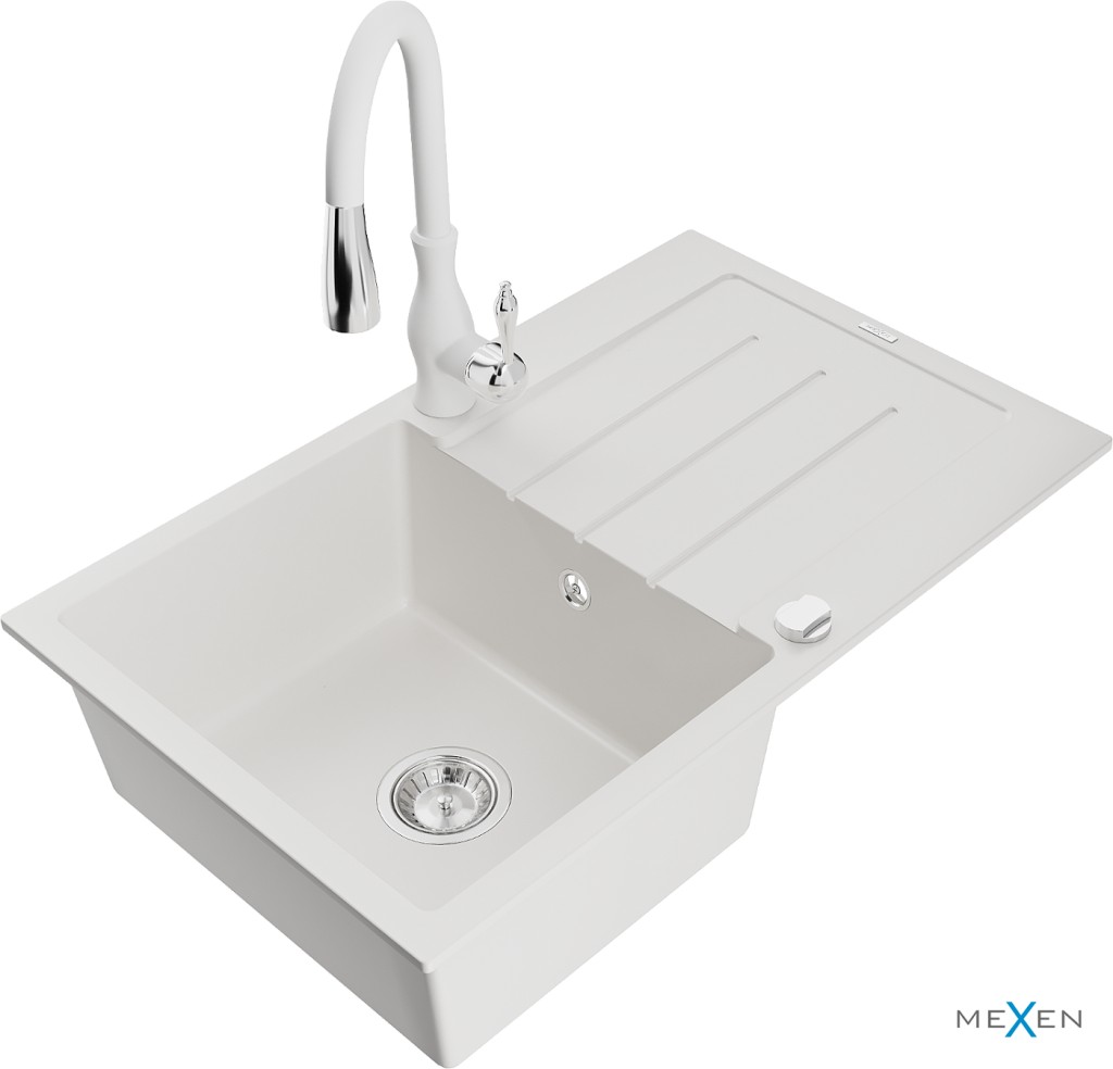 Technické dáta: drez: Rozmer: 795 x 495 x 200 mm Hĺbka komory: 200 mm Rozmery komory: 440x360 mm Priemer odtoku: ø90 mm Typ: 1-miska s odkvapkávačom Typ: Zapustené do pracovnej dosky biela farba Povrchová úprava sifónu: Chrome Materiál: žula (80% žulové kamenivo, 20% živice) Prepadový otvor: Áno Otvory: (batérie, automatické) 2 Inštalácia: Univerzálna, je možné inštalovať s odkvapkávačom na ľavú alebo pravú stranu Vysoká odolnosť proti poškriabaniu a zmene farby Odolnosť proti tepelným šokom Ľahko čistiteľný povrch Dva dodatočné vyfrézované otvory na samodierovanie ø35 kuchynská batéria: Materiál: mosadz biela farba Hlava: Keramická Prevzdušňovač: Áno Typ: Jedna páka Výška batérie: 410 mm Rozsah výtoku: 231 mm (GT) Ean: 5905315035455