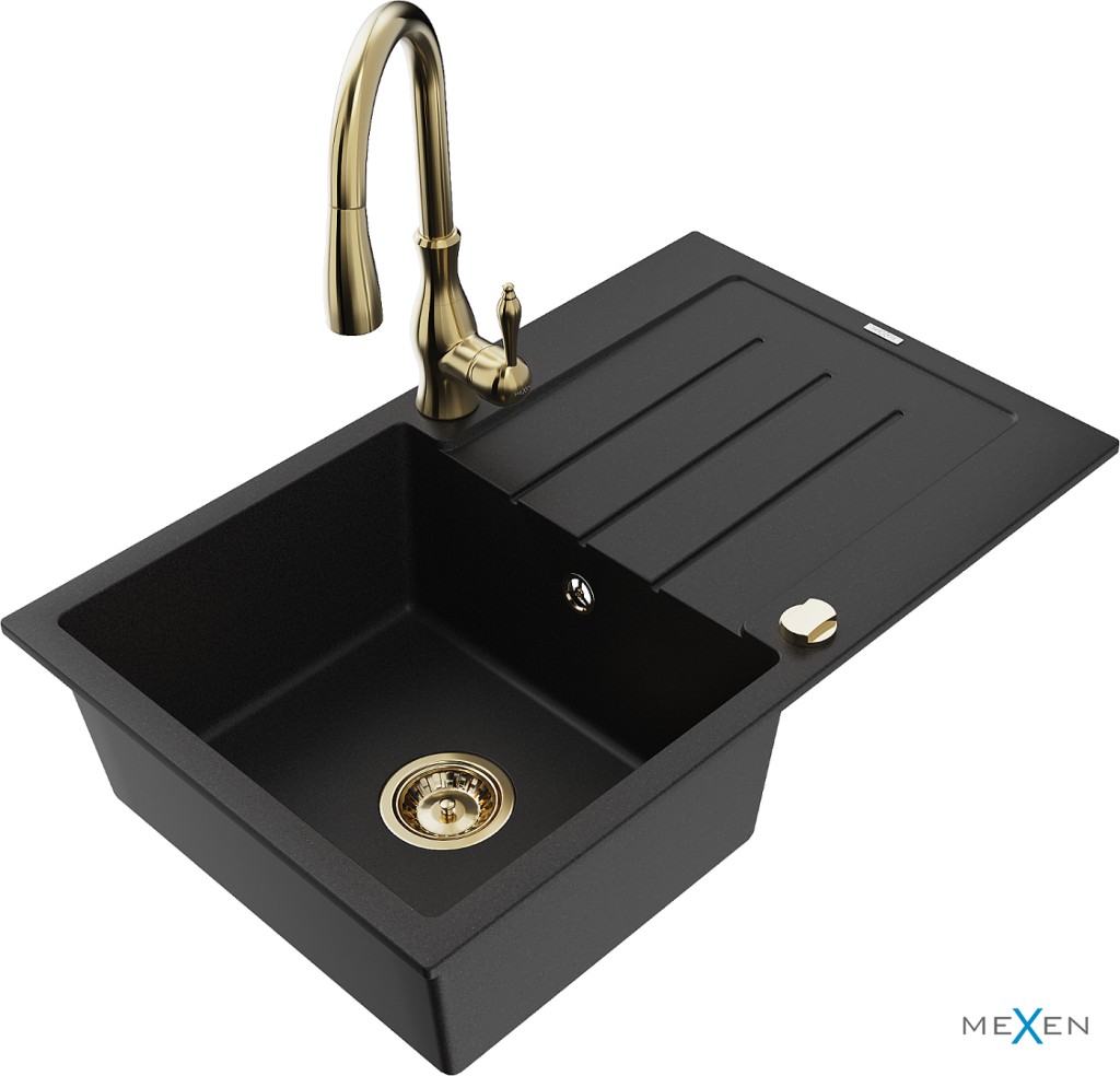 Technické dáta: drez: Rozmer: 795 x 495 x 200 mm Hĺbka komory: 200 mm Rozmery komory: 440x360 mm Priemer odtoku: ø90 mm Typ: 1-miska s odkvapkávačom Typ: Zapustené do pracovnej dosky Čierna farba Povrchová úprava sifónu: zlatá Materiál: žula (80% žulové kamenivo, 20% živice) Prepadový otvor: Áno Otvory: (batérie, automatické) 2 Inštalácia: Univerzálna, je možné inštalovať s odkvapkávačom na ľavú alebo pravú stranu Vysoká odolnosť proti poškriabaniu a zmene farby Odolnosť proti tepelným šokom Ľahko čistiteľný povrch Dva dodatočné vyfrézované otvory na samodierovanie ø35 kuchynská batéria: Materiál: mosadz Farba: Zlatá Hlava: Keramická Prevzdušňovač: Áno Typ: Jedna páka Výška batérie: 410 mm Rozsah výtoku: 231 mm(GT) Ean: 5905315035721