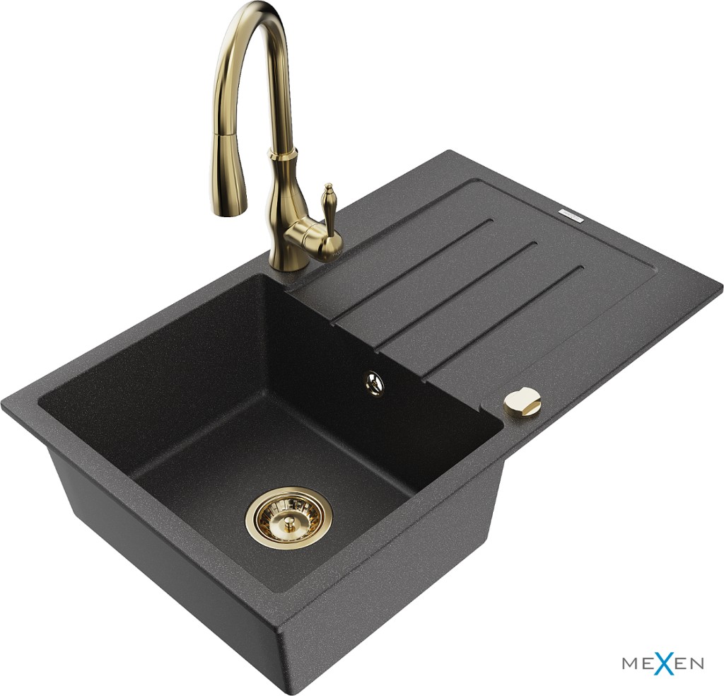 Technické dáta: drez: Rozmer: 795 x 495 x 200 mm Hĺbka komory: 200 mm Rozmery komory: 440x360 mm Priemer odtoku: ø90 mm Typ: 1-miska s odkvapkávačom Typ: Zapustené do pracovnej dosky Farba: Škvrnitá čierna Povrchová úprava sifónu: zlatá Materiál: žula (80% žulové kamenivo, 20% živice) Prepadový otvor: Áno Otvory: (batérie, automatické) 2 Inštalácia: Univerzálna, je možné inštalovať s odkvapkávačom na ľavú alebo pravú stranu Vysoká odolnosť proti poškriabaniu a zmene farby Odolnosť proti tepelným šokom Ľahko čistiteľný povrch Dva dodatočné vyfrézované otvory na samodierovanie ø35 kuchynská batéria: Materiál: mosadz Farba: Zlatá Hlava: Keramická Prevzdušňovač: Áno Typ: Jedna páka Výška batérie: 410 mm Rozsah výtoku: 231 mm(GT) Ean: 5905315035677