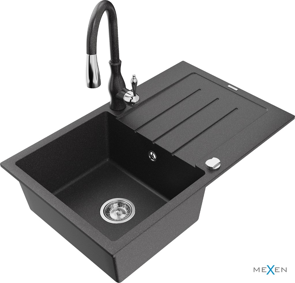 Technické dáta: drez: Rozmer: 795 x 495 x 200 mm Hĺbka komory: 200 mm Rozmery komory: 440x360 mm Priemer odtoku: ø90 mm Typ: 1-miska s odkvapkávačom Typ: Zapustené do pracovnej dosky Farba: Škvrnitá čierna Povrchová úprava sifónu: Chrome Materiál: žula (80% žulové kamenivo, 20% živice) Prepadový otvor: Áno Otvory: (batérie, automatické) 2 Inštalácia: Univerzálna, je možné inštalovať s odkvapkávačom na ľavú alebo pravú stranu Vysoká odolnosť proti poškriabaniu a zmene farby Odolnosť proti tepelným šokom Ľahko čistiteľný povrch Dva dodatočné vyfrézované otvory na samodierovanie ø35 kuchynská batéria: Materiál: mosadz Farba: Škvrnitá čierna Hlava: Keramická Prevzdušňovač: Áno Typ: Jedna páka Výška batérie: 410 mm Rozsah výtoku: 231 mm(GT) Ean: 5905315035707
