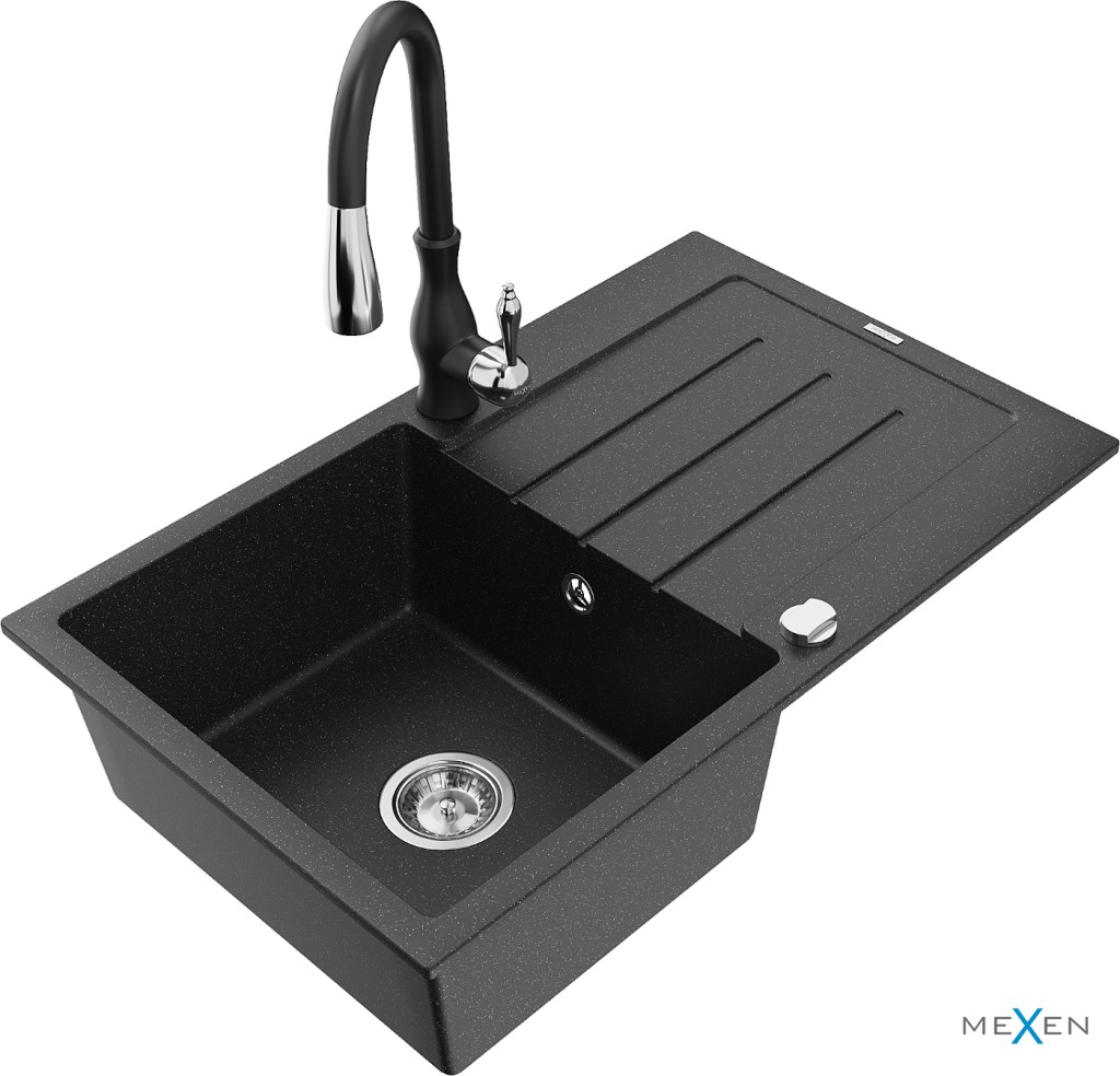 Technické dáta: drez: Rozmer: 795 x 495 x 200 mm Hĺbka komory: 200 mm Rozmery komory: 440x360 mm Priemer odtoku: ø90 mm Typ: 1-miska s odkvapkávačom Typ: Zapustené do pracovnej dosky Farba: čierna/strieborná metalíza Povrchová úprava sifónu: Chrome Materiál: žula (80% žulové kamenivo, 20% živice) Prepadový otvor: Áno Otvory: (batérie, automatické) 2 Inštalácia: Univerzálna, je možné inštalovať s odkvapkávačom na ľavú alebo pravú stranu Vysoká odolnosť proti poškriabaniu a zmene farby Odolnosť proti tepelným šokom Ľahko čistiteľný povrch Dva dodatočné vyfrézované otvory na samodierovanie ø35 kuchynská batéria: Materiál: mosadz Čierna farba Hlava: Keramická Prevzdušňovač: Áno Typ: Jedna páka Výška batérie: 410 mm Rozsah výtoku: 231 mm(GT) Ean: 5905315035615