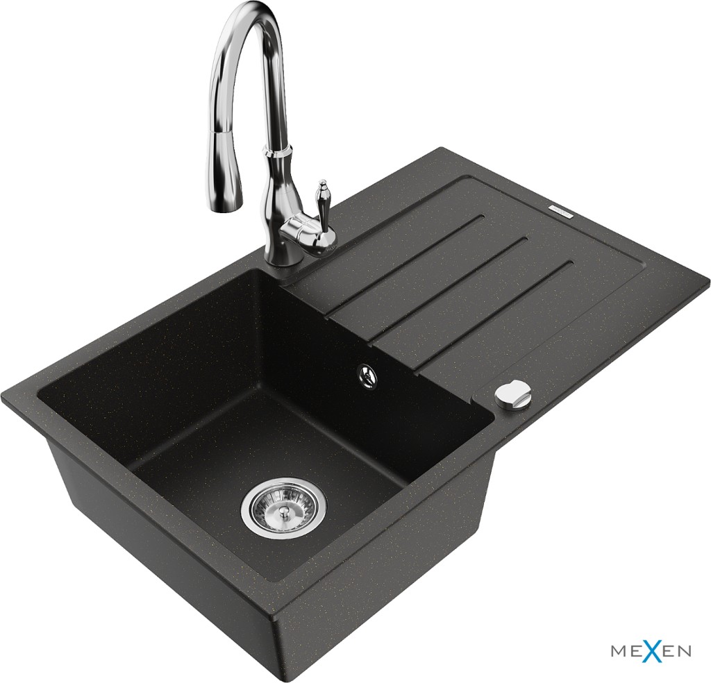 Technické dáta: drez: Rozmer: 795 x 495 x 200 mm Hĺbka komory: 200 mm Rozmery komory: 440x360 mm Priemer odtoku: ø90 mm Typ: 1-miska s odkvapkávačom Typ: Zapustené do pracovnej dosky Farba: čierna / zlatá metalíza Povrchová úprava sifónu: Chrome Materiál: žula (80% žulové kamenivo, 20% živice) Prepadový otvor: Áno Otvory: (batérie, automatické) 2 Inštalácia: Univerzálna, je možné inštalovať s odkvapkávačom na ľavú alebo pravú stranu Vysoká odolnosť proti poškriabaniu a zmene farby Odolnosť proti tepelným šokom Ľahko čistiteľný povrch Dva dodatočné vyfrézované otvory na samodierovanie ø35 kuchynská batéria: Materiál: mosadz Farba: Chrome Hlava: Keramická Prevzdušňovač: Áno Typ: Jedna páka Výška batérie: 410 mm Rozsah výtoku: 231 mm(GT) Ean: 5905315035608