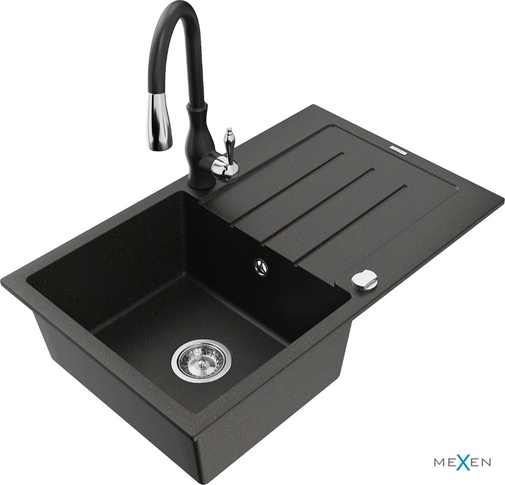 Technické dáta: drez: Rozmer: 795 x 495 x 200 mm Hĺbka komory: 200 mm Rozmery komory: 440x360 mm Priemer odtoku: ø90 mm Typ: 1-miska s odkvapkávačom Typ: Zapustené do pracovnej dosky Farba: čierna / zlatá metalíza Povrchová úprava sifónu: Chrome Materiál: žula (80% žulové kamenivo, 20% živice) Prepadový otvor: Áno Otvory: (batérie, automatické) 2 Inštalácia: Univerzálna, je možné inštalovať s odkvapkávačom na ľavú alebo pravú stranu Vysoká odolnosť proti poškriabaniu a zmene farby Odolnosť proti tepelným šokom Ľahko čistiteľný povrch Dva dodatočné vyfrézované otvory na samodierovanie ø35 kuchynská batéria: Materiál: mosadz Čierna farba Hlava: Keramická Prevzdušňovač: Áno Typ: Jedna páka Výška batérie: 410 mm Rozsah výtoku: 231 mm(GT) Ean: 5905315035653