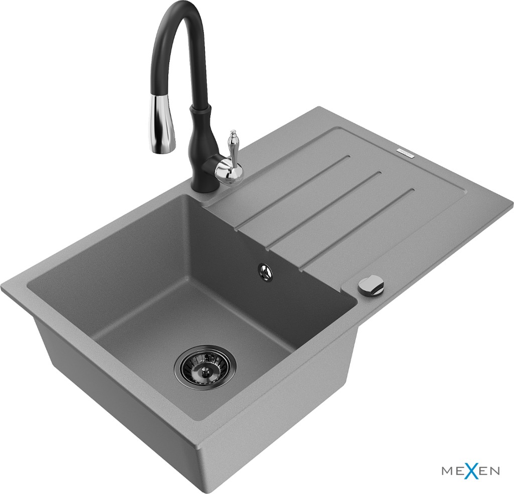 Technické dáta: drez: Rozmer: 795 x 495 x 200 mm Hĺbka komory: 200 mm Rozmery komory: 440x360 mm Priemer odtoku: ø90 mm Typ: 1-miska s odkvapkávačom Typ: Zapustené do pracovnej dosky Šedá farba Povrchová úprava sifónu: čierna Materiál: žula (80% žulové kamenivo, 20% živice) Prepadový otvor: Áno Otvory: (batérie, automatické) 2 Inštalácia: Univerzálna, je možné inštalovať s odkvapkávačom na ľavú alebo pravú stranu Vysoká odolnosť proti poškriabaniu a zmene farby Odolnosť proti tepelným šokom Ľahko čistiteľný povrch Dva dodatočné vyfrézované otvory na samodierovanie ø35 kuchynská batéria: Materiál: mosadz Čierna farba Hlava: Keramická Prevzdušňovač: Áno Typ: Jedna páka Výška batérie: 410 mm Rozsah výtoku: 231 mm(GT) Ean: 5905315035554