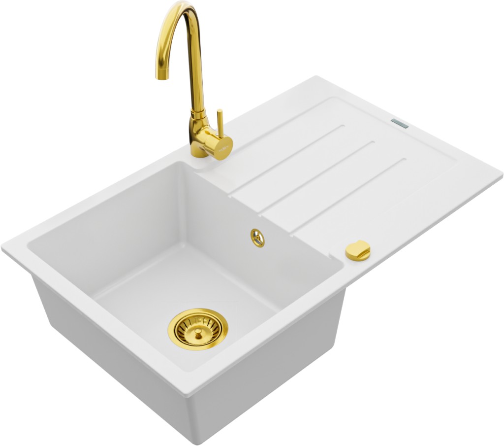 Technické dáta: drez: Rozmer: 795 x 495 x 200 mm Hĺbka komory: 200 mm Rozmery komory: 440x360 mm Priemer odtoku: ø90 mm Typ: 1-miska s odkvapkávačom Typ: Zapustené do pracovnej dosky biela farba Povrchová úprava sifónu: zlatá Materiál: žula (80% žulové kamenivo, 20% živice) Prepadový otvor: Áno Otvory: (batérie, automatické) 2 Inštalácia: Univerzálna, je možné inštalovať s odkvapkávačom na ľavú alebo pravú stranu Vysoká odolnosť proti poškriabaniu a zmene farby Odolnosť proti tepelným šokom Ľahko čistiteľný povrch Dva dodatočné vyfrézované otvory na samodierovanie ø35 kuchynská batéria: Materiál: mosadz Farba: Zlatá Hlava: Keramická Prevzdušňovač: Áno Výška batérie: 335 mm Rozsah výtoku: 180 mm(GT) Ean: 5907709160637