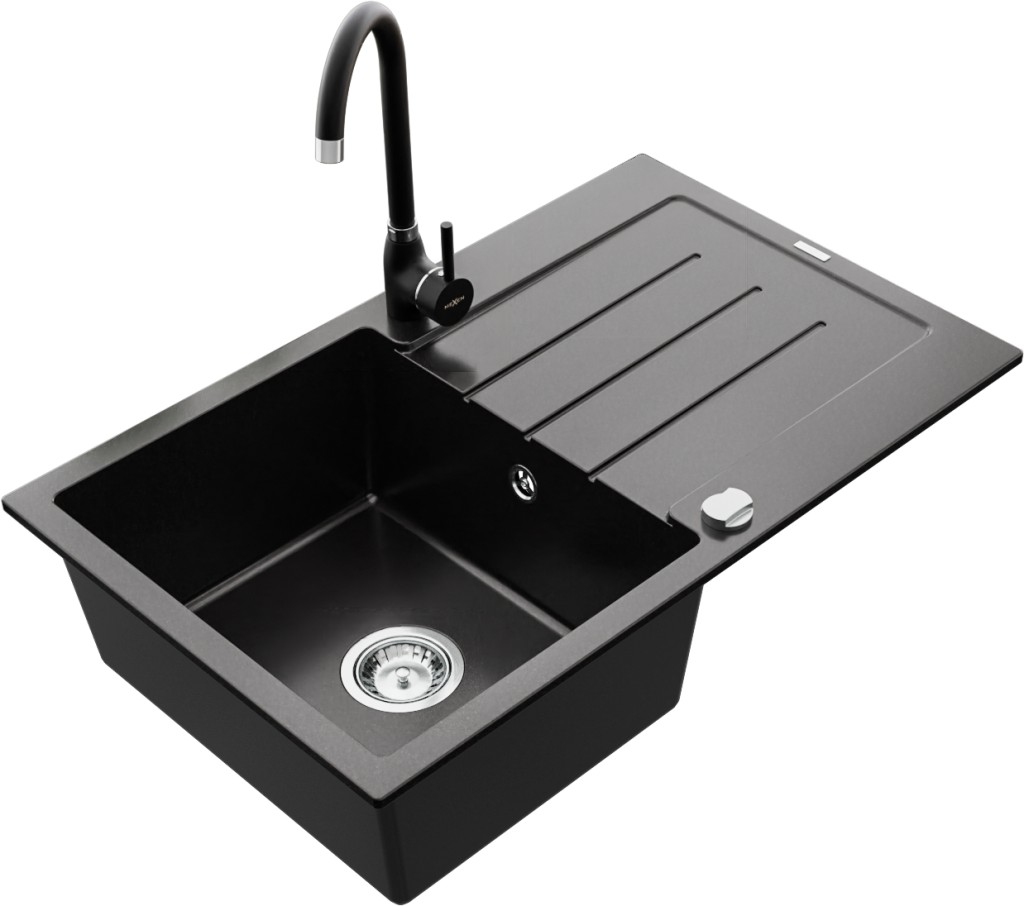 Technické dáta: drez: Rozmer: 795 x 495 x 200 mm Hĺbka komory: 200 mm Rozmery komory: 440x360 mm Priemer odtoku: ø90 mm Typ: 1-miska s odkvapkávačom Typ: Zapustené do pracovnej dosky Čierna farba Povrchová úprava sifónu: zlatá Materiál: žula (80% žulové kamenivo, 20% živice) Prepadový otvor: Áno Otvory: (batérie, automatické) 2 Inštalácia: Univerzálna, je možné inštalovať s odkvapkávačom na ľavú alebo pravú stranu Vysoká odolnosť proti poškriabaniu a zmene farby Odolnosť proti tepelným šokom Ľahko čistiteľný povrch Dva dodatočné vyfrézované otvory na samodierovanie ø35 kuchynská batéria: Materiál: mosadz Čierna farba Hlava: Keramická Prevzdušňovač: Áno Výška batérie: 335 mm Rozsah výtoku: 180 mm(GT) Ean: 5907709160750