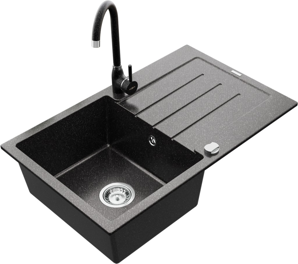 Technické dáta: drez: Rozmer: 795 x 495 x 200 mm Hĺbka komory: 200 mm Rozmery komory: 440x360 mm Priemer odtoku: ø90 mm Typ: 1-miska s odkvapkávačom Typ: Zapustené do pracovnej dosky Farba: Škvrnitá čierna Povrchová úprava sifónu: Chrome Materiál: žula (80% žulové kamenivo, 20% živice) Prepadový otvor: Áno Otvory: (batérie, automatické) 2 Inštalácia: Univerzálna, je možné inštalovať s odkvapkávačom na ľavú alebo pravú stranu Vysoká odolnosť proti poškriabaniu a zmene farby Odolnosť proti tepelným šokom Ľahko čistiteľný povrch Dva dodatočné vyfrézované otvory na samodierovanie ø35 kuchynská batéria: Materiál: mosadz Farba: Škvrnitá čierna Hlava: Keramická Prevzdušňovač: Áno Výška batérie: 335 mm Rozsah výtoku: 180 mm(GT) Ean: 5907709160729