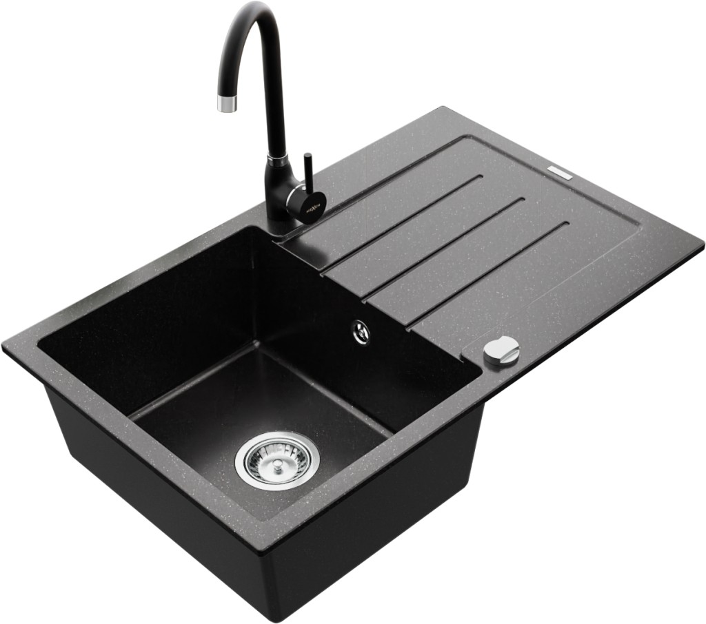 Technické dáta: drez: Rozmer: 795 x 495 x 200 mm Hĺbka komory: 200 mm Rozmery komory: 440x360 mm Priemer odtoku: ø90 mm Typ: 1-miska s odkvapkávačom Typ: Zapustené do pracovnej dosky Farba: čierna/strieborná metalíza Povrchová úprava sifónu: Chrome Materiál: žula (80% žulové kamenivo, 20% živice) Prepadový otvor: Áno Otvory: (batérie, automatické) 2 Inštalácia: Univerzálna, je možné inštalovať s odkvapkávačom na ľavú alebo pravú stranu Vysoká odolnosť proti poškriabaniu a zmene farby Odolnosť proti tepelným šokom Ľahko čistiteľný povrch Dva dodatočné vyfrézované otvory na samodierovanie ø35 kuchynská batéria: Materiál: mosadz Čierna farba Hlava: Keramická Prevzdušňovač: Áno Výška batérie: 335 mm Rozsah výtoku: 180 mm(GT) Ean: 5907709160682