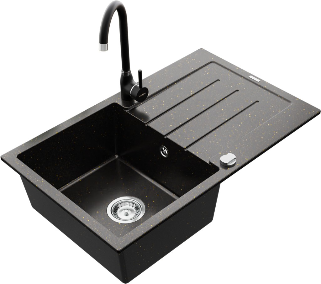 Technické dáta: drez: Rozmer: 795 x 495 x 200 mm Hĺbka komory: 200 mm Rozmery komory: 440x360 mm Priemer odtoku: ø90 mm Typ: 1-miska s odkvapkávačom Typ: Zapustené do pracovnej dosky Farba: čierna / zlatá metalíza Povrchová úprava sifónu: Chrome Materiál: žula (80% žulové kamenivo, 20% živice) Prepadový otvor: Áno Otvory: (batérie, automatické) 2 Inštalácia: Univerzálna, je možné inštalovať s odkvapkávačom na ľavú alebo pravú stranu Vysoká odolnosť proti poškriabaniu a zmene farby Odolnosť proti tepelným šokom Ľahko čistiteľný povrch Dva dodatočné vyfrézované otvory na samodierovanie ø35 kuchynská batéria: Materiál: mosadz Čierna farba Hlava: Keramická Prevzdušňovač: Áno Výška batérie: 335 mm Rozsah výtoku: 180 mm(GT) Ean: 5907709160705