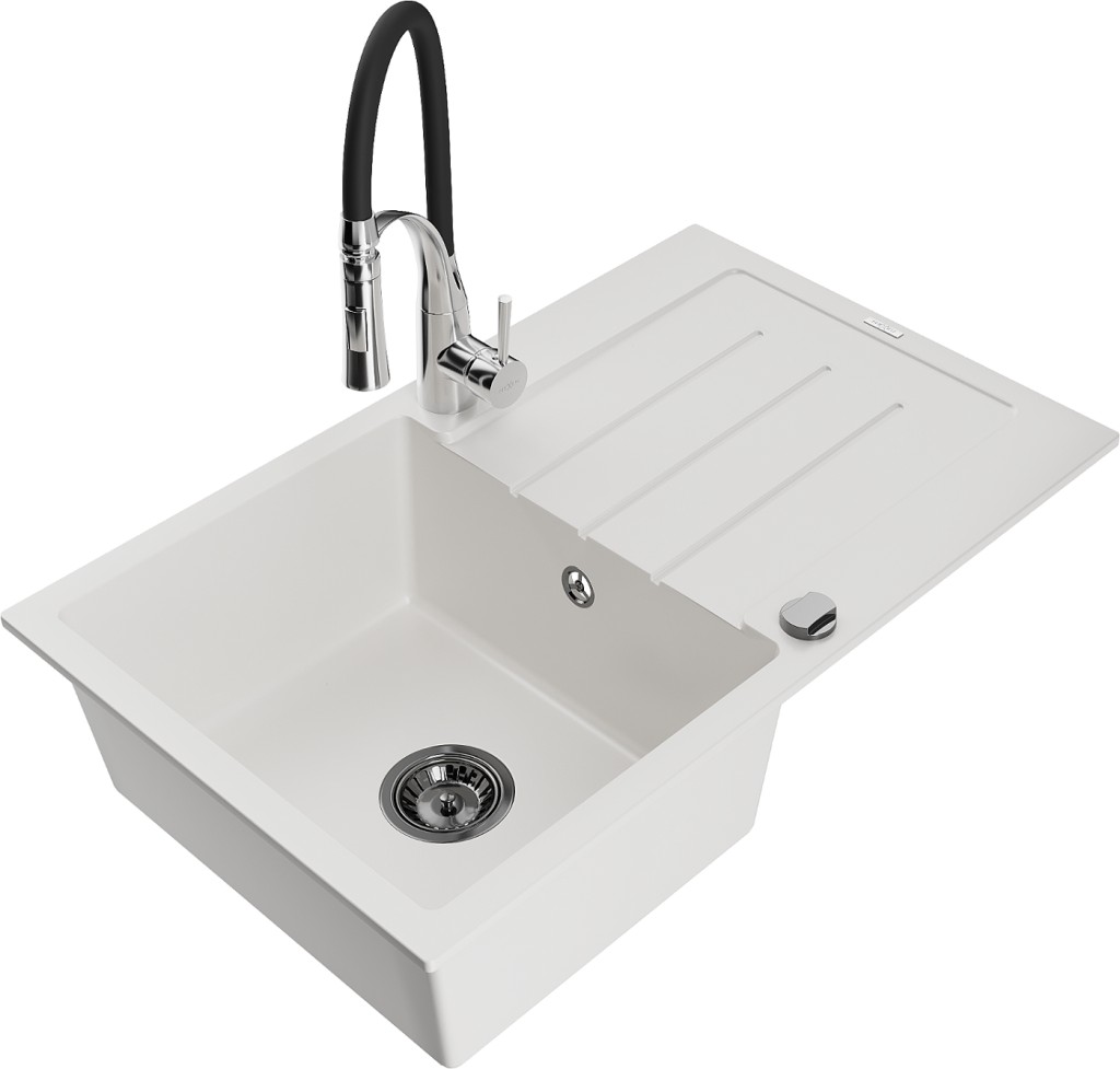 Technické dáta: drez: Rozmer: 795 x 495 x 200 mm Hĺbka komory: 200 mm Rozmery komory: 440x360 mm Priemer odtoku: ø90 mm Typ: 1-miska s odkvapkávačom Typ: Zapustené do pracovnej dosky biela farba Povrchová úprava sifónu: čierna Materiál: žula (80% žulové kamenivo, 20% živice) Prepadový otvor: Áno Otvory: (batérie, automatické) 2 Inštalácia: Univerzálna, je možné inštalovať s odkvapkávačom na ľavú alebo pravú stranu Vysoká odolnosť proti poškriabaniu a zmene farby Odolnosť proti tepelným šokom Ľahko čistiteľný povrch Dva dodatočné vyfrézované otvory na samodierovanie ø35 kuchynská batéria: Materiál: mosadz Farba: chróm/čierna Hlava: Keramická Prevzdušňovač: Áno Typ: Jedna páka Výška batérie: 430 mm Rozsah výtoku: 185 mm Batéria má výsuvný výtok(GT) Ean: 5905315046734