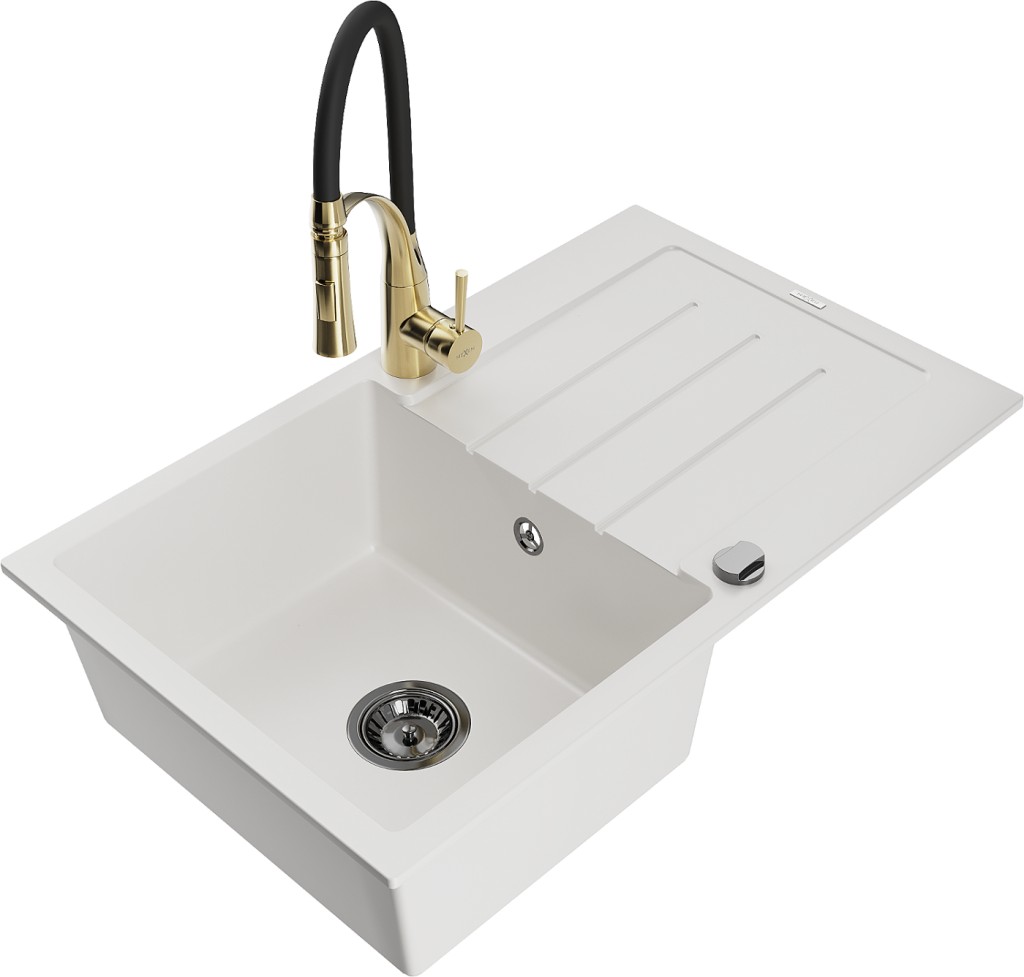 Technické dáta: drez: Rozmer: 795 x 495 x 200 mm Hĺbka komory: 200 mm Rozmery komory: 440x360 mm Priemer odtoku: ø90 mm Typ: 1-miska s odkvapkávačom Typ: Zapustené do pracovnej dosky biela farba Povrchová úprava sifónu: čierna Materiál: žula (80% žulové kamenivo, 20% živice) Prepadový otvor: Áno Otvory: (batérie, automatické) 2 Inštalácia: Univerzálna, je možné inštalovať s odkvapkávačom na ľavú alebo pravú stranu Vysoká odolnosť proti poškriabaniu a zmene farby Odolnosť proti tepelným šokom Ľahko čistiteľný povrch Dva dodatočné vyfrézované otvory na samodierovanie ø35 kuchynská batéria: Materiál: mosadz Farba: Zlatá/Čierna Hlava: Keramická Prevzdušňovač: Áno Typ: Jedna páka Výška batérie: 430 mm Rozsah výtoku: 185 mm Batéria má výsuvný výtok(GT) Ean: 5905315046758